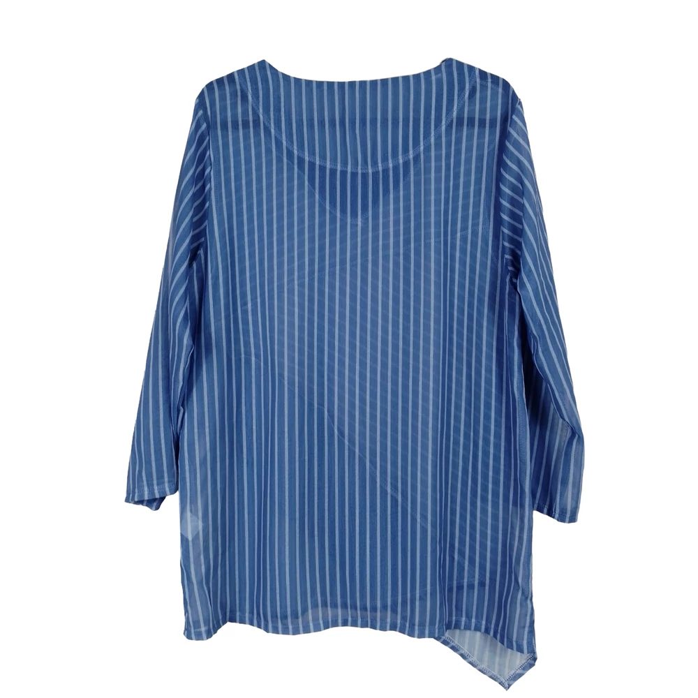 Mellrészén gombos, alján oldalt hosszított, mintás női felső