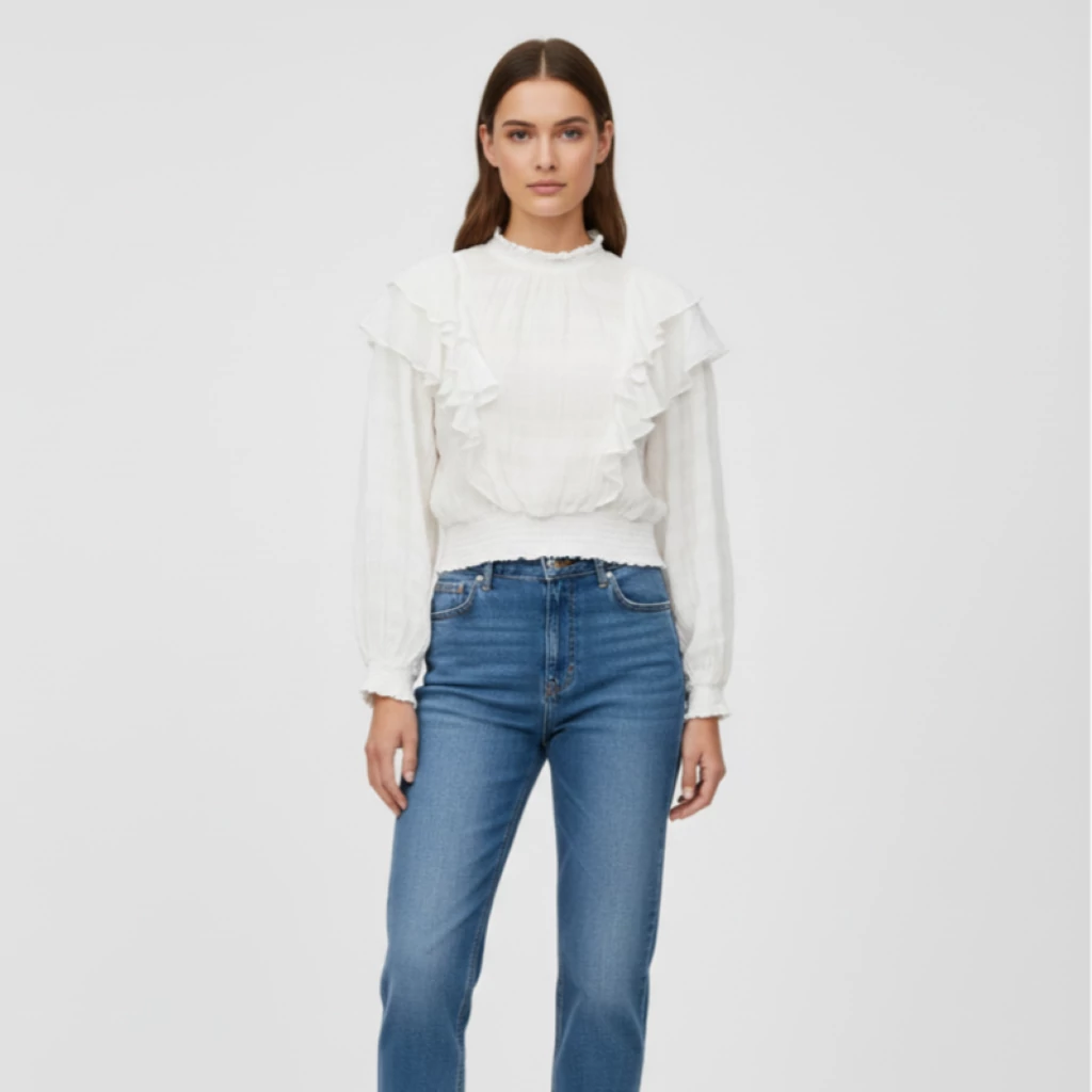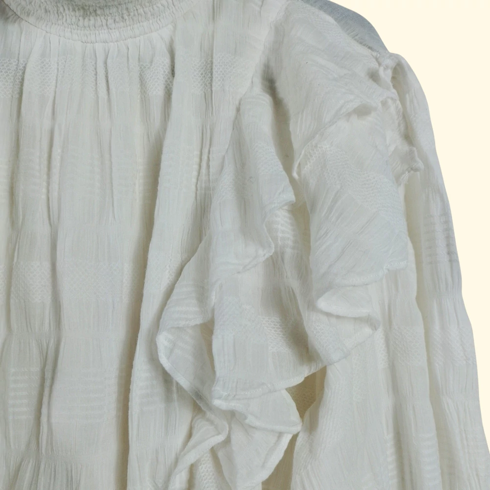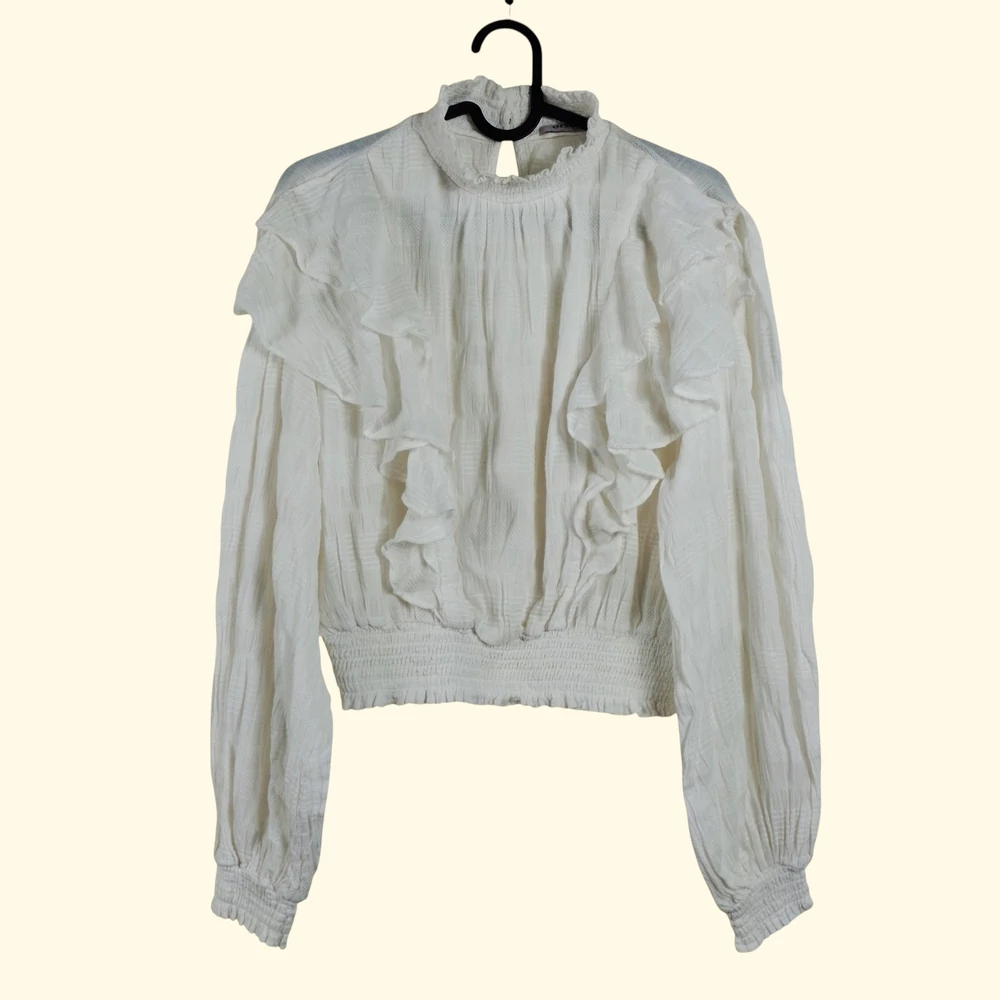 Virágmintás, derékrészén gumis, mellrészén fodros női felső