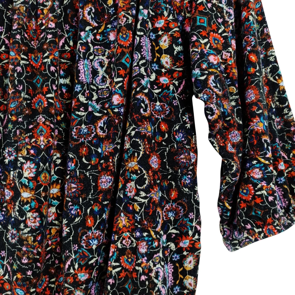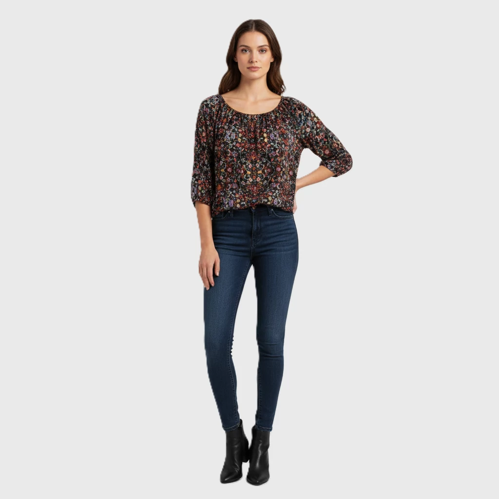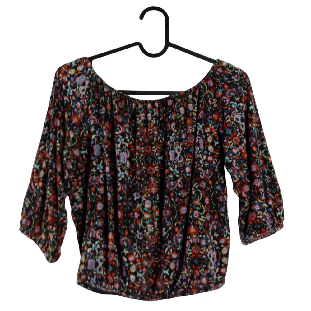 Alján és ujja végén gumis, rövid fazonú, mintás női felső