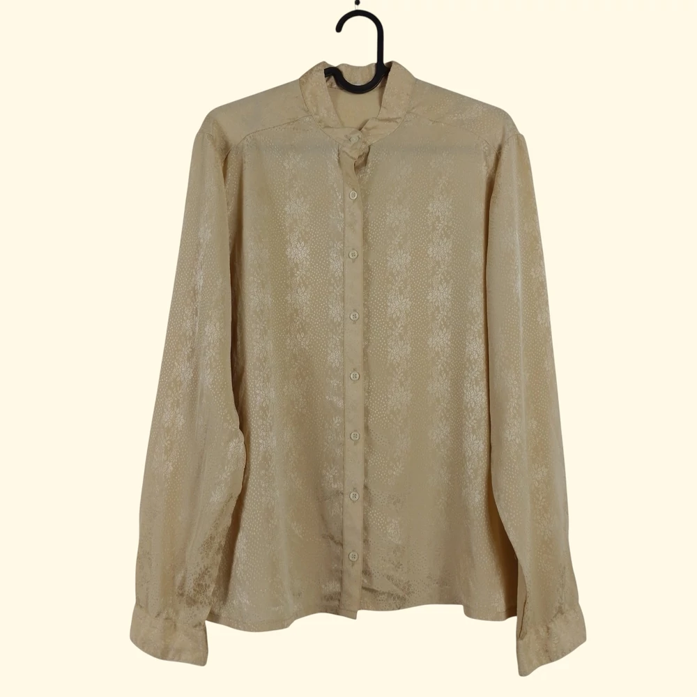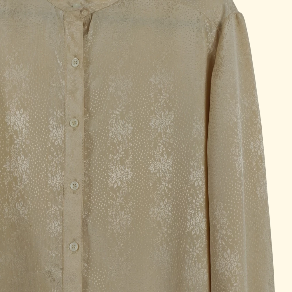 Mellrészén gombos, alján oldalt hosszított, mintás női felső