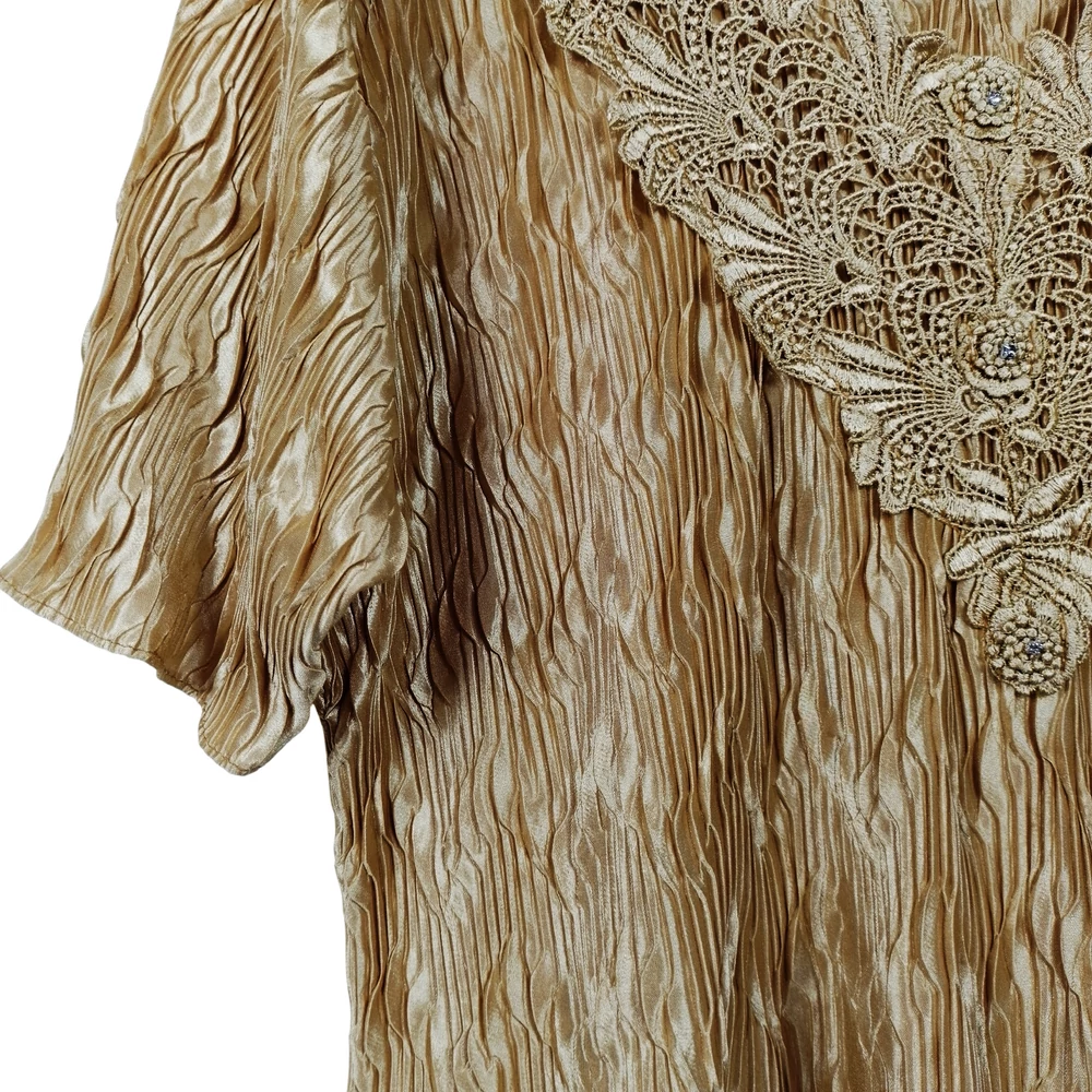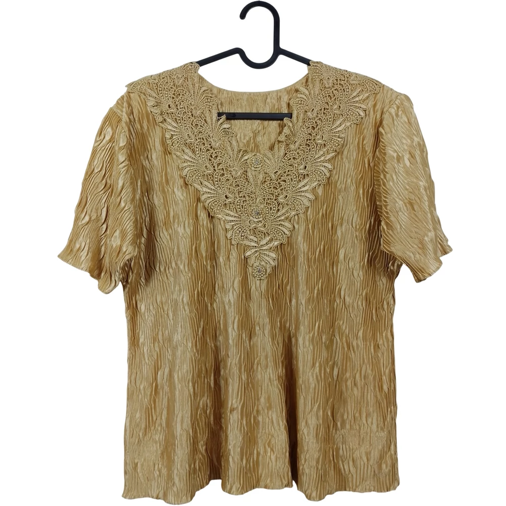 Mellrészén gombos, alján oldalt hosszított, mintás női felső