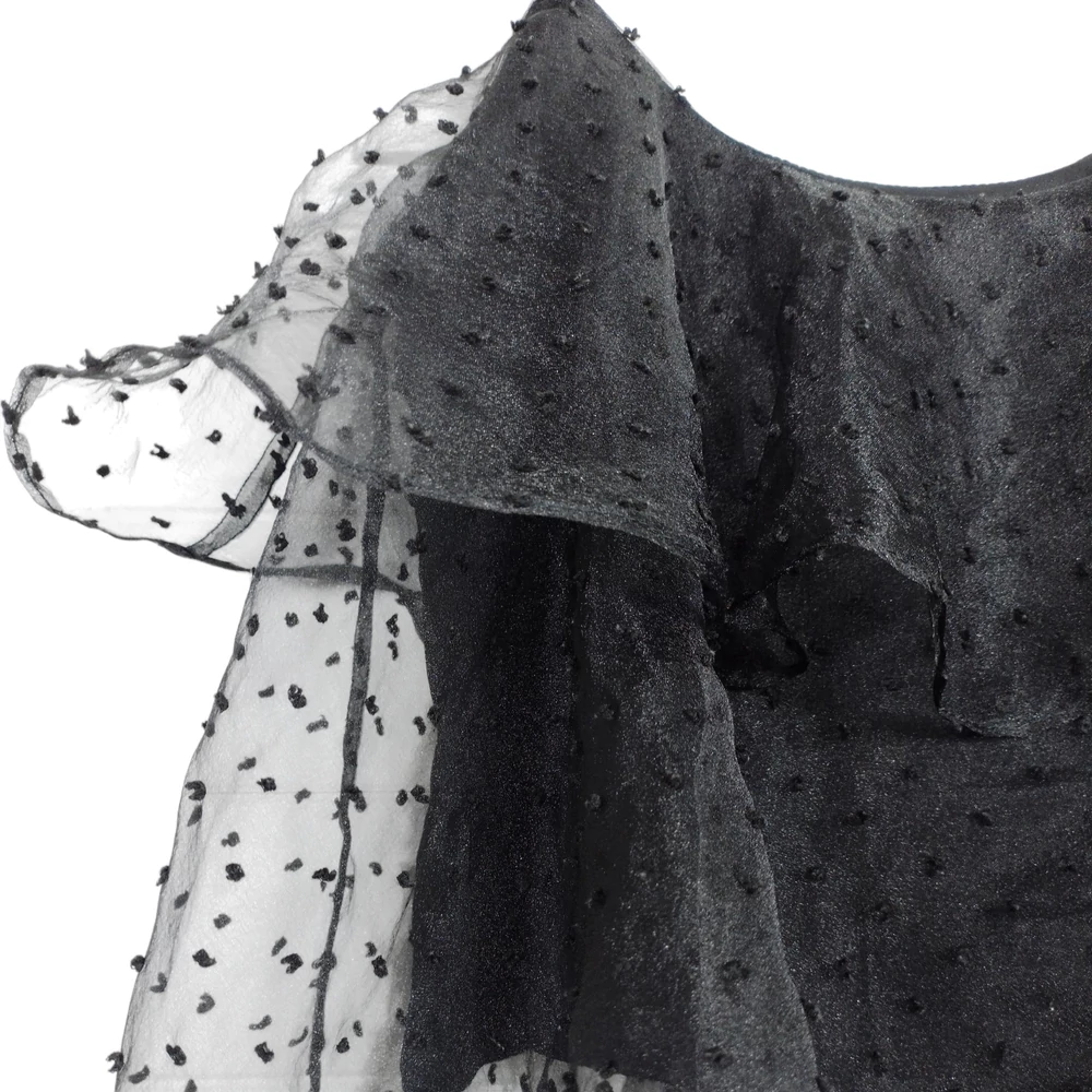 Nyakrészén gumis, ujja végén fodros, bélelt női felső