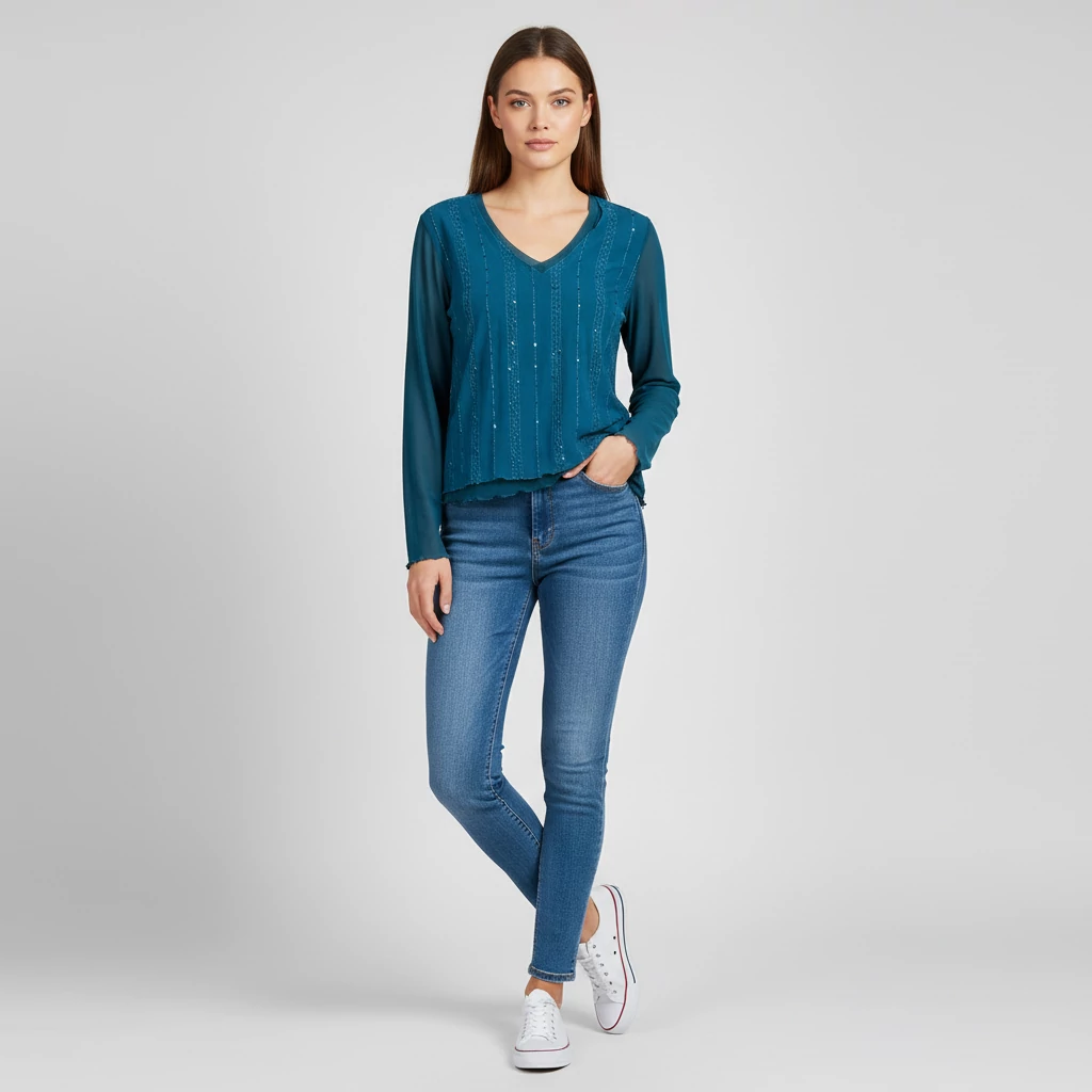 Vállán strasszkővel díszített, elején dupla anyagú női felső