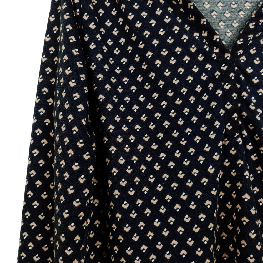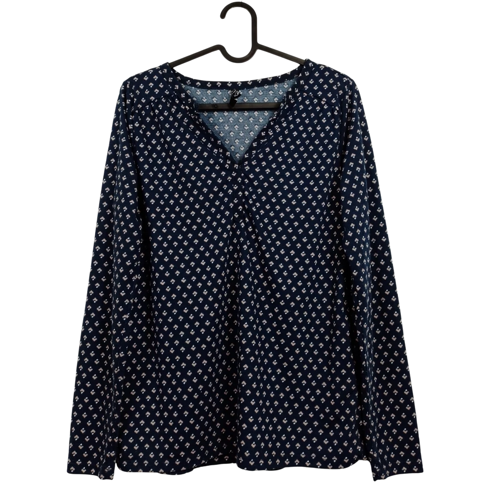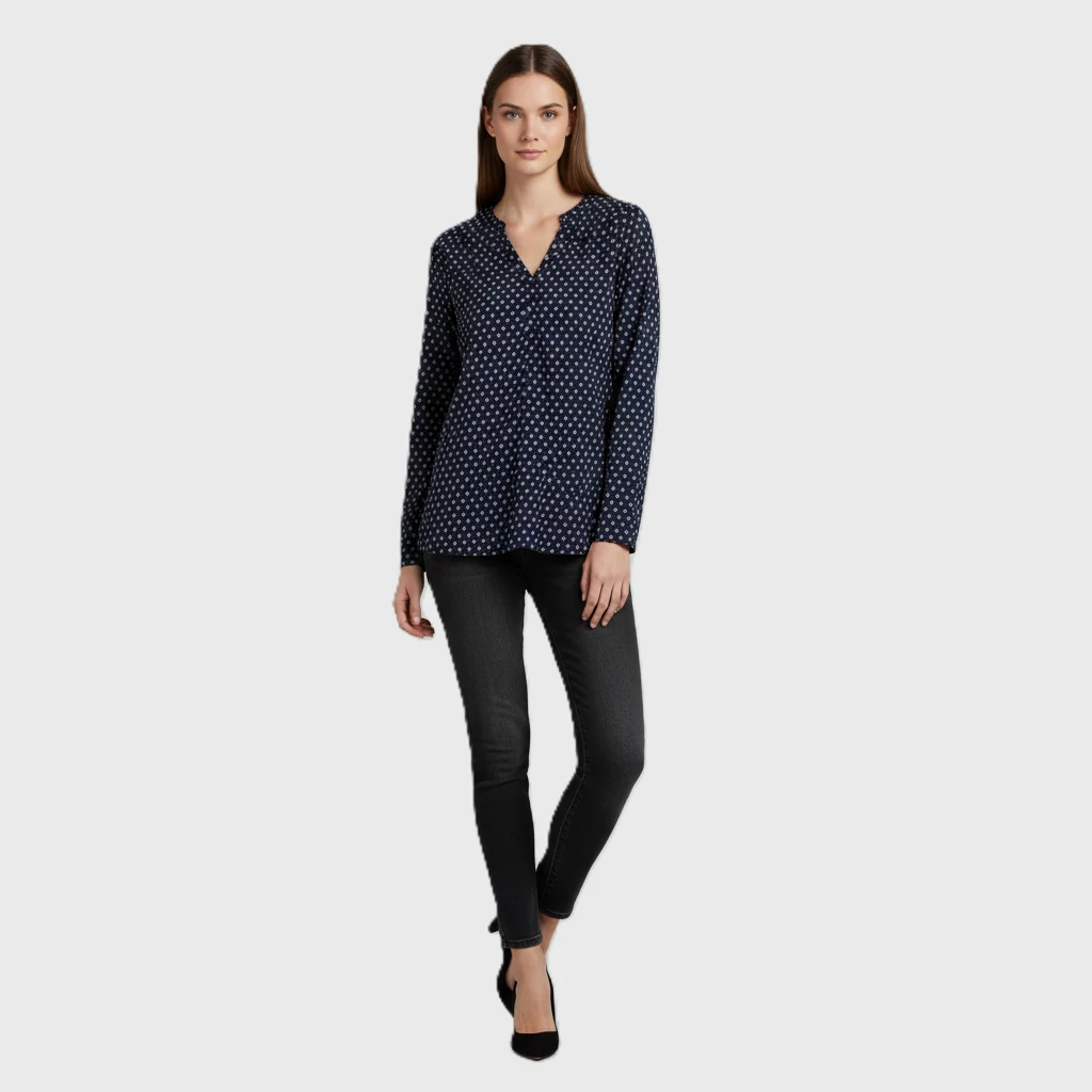 Elején ejtett anyagú, egyik oldalán húzott varrású, mintás női felső