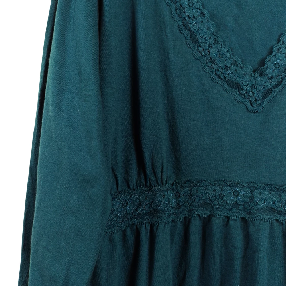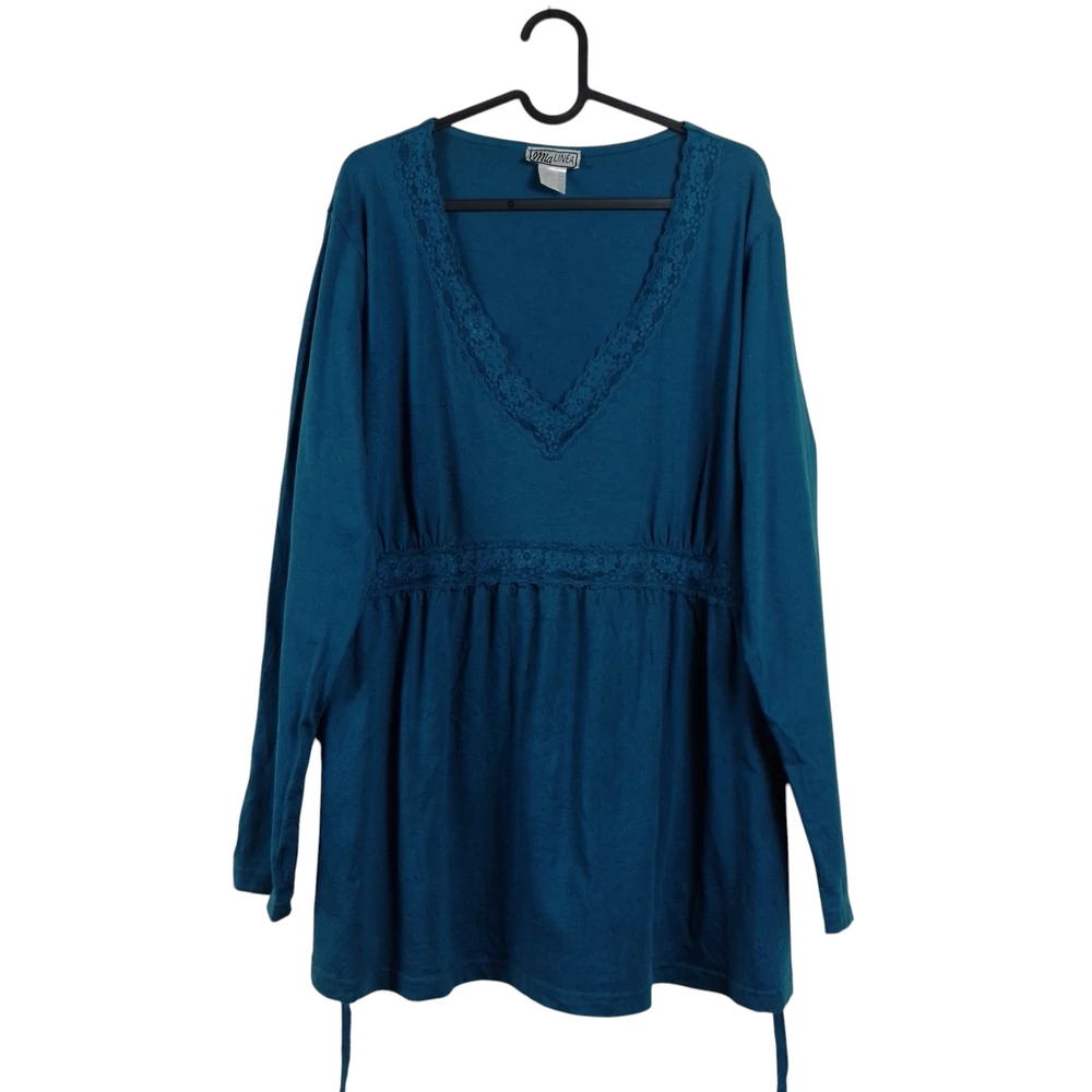 Mellrészén gombos, alján oldalt hosszított, mintás női felső