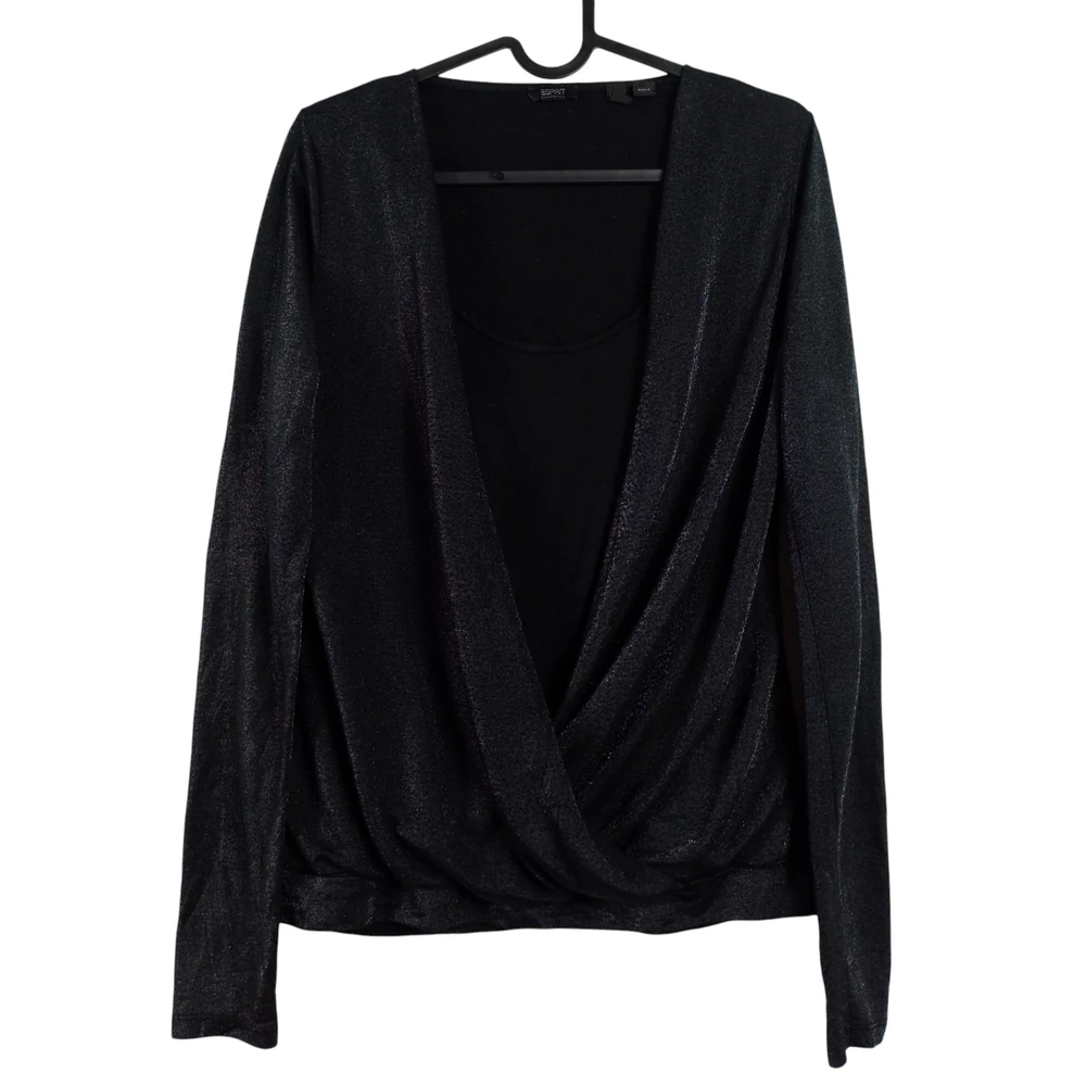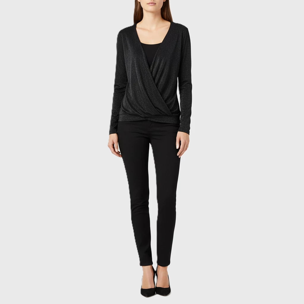 Elején átlapolt, dupla hatású, csillogó anyagú női felső