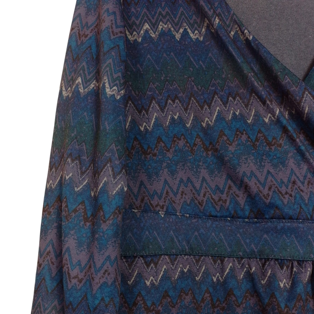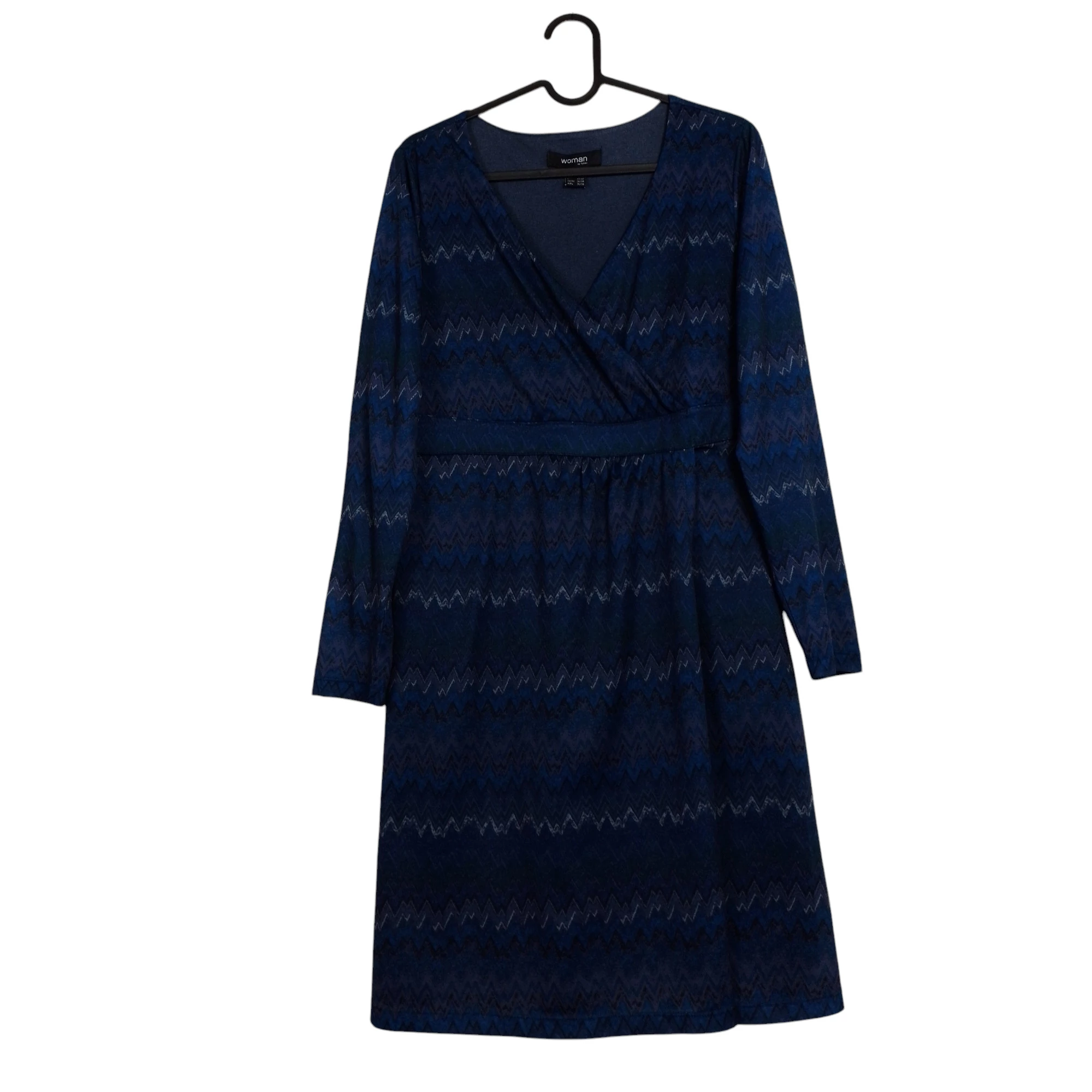 Elején nyitott, mellrészén megkötős, mintás női egész ruha