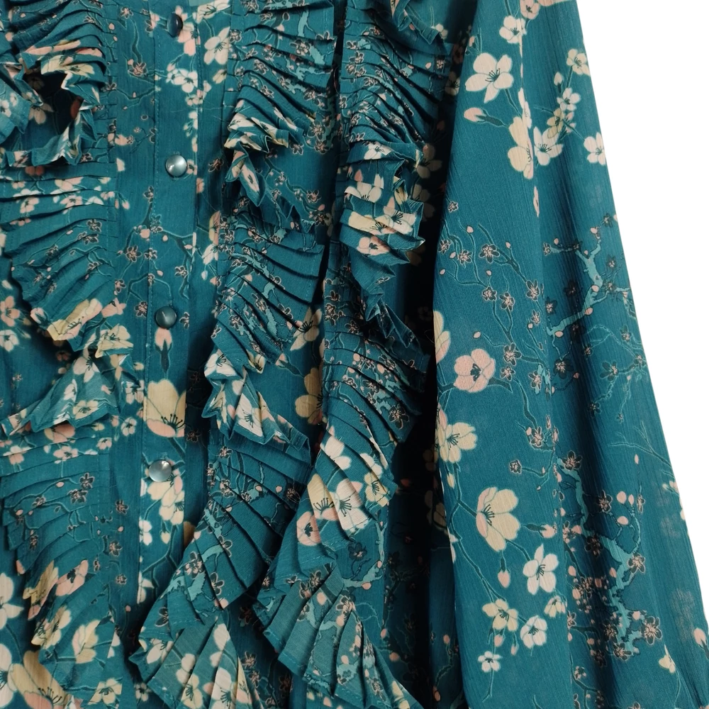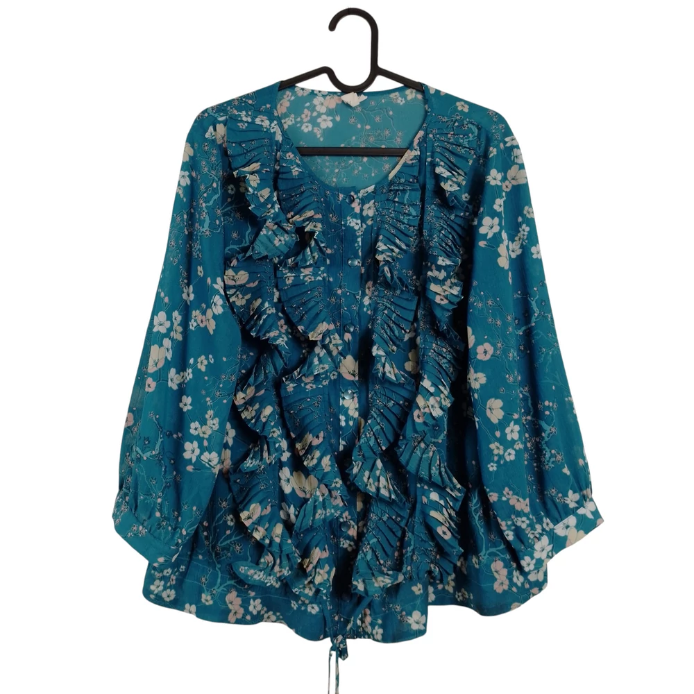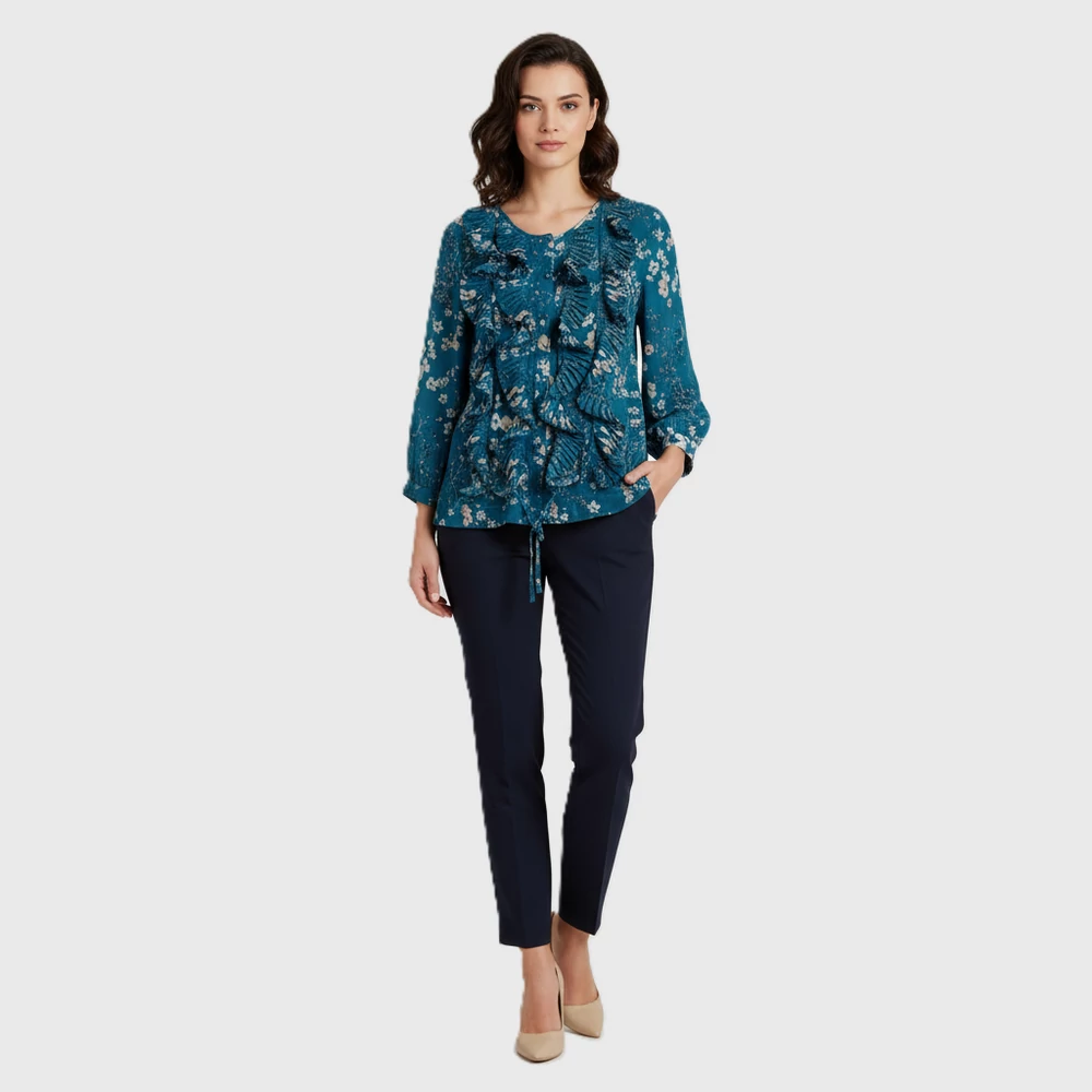 Elején gombos és fodros, alján megkötős, mintás női felső