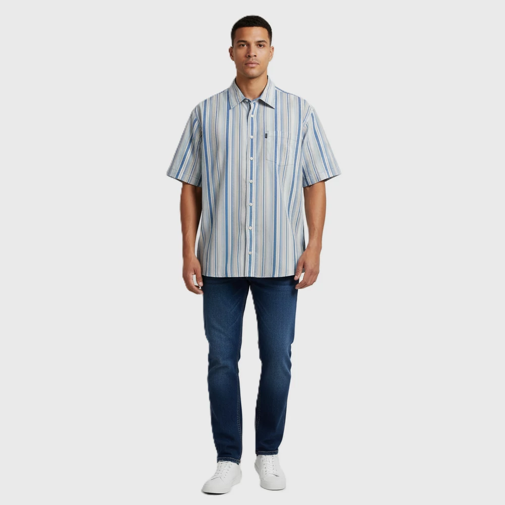 Háta alján zsebes, elején cipzáras, mintás (kerékpáros) férfi póló