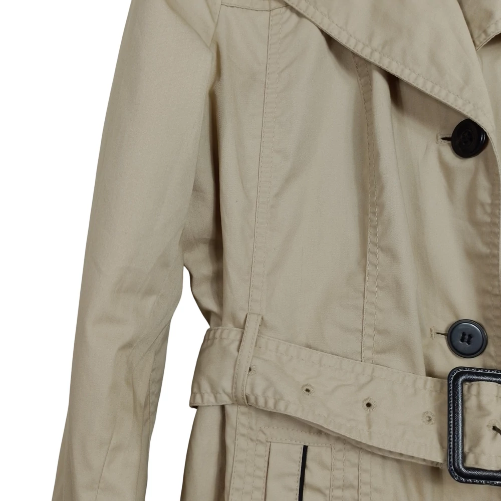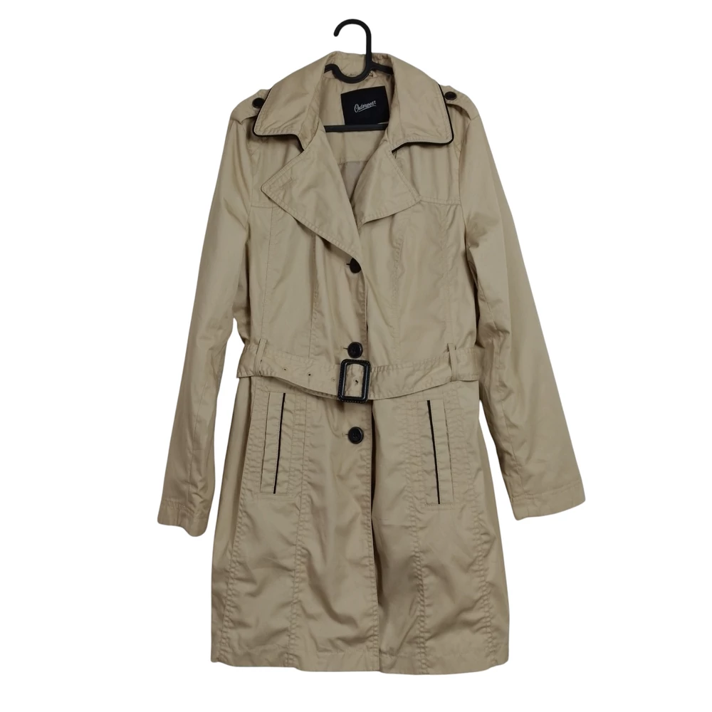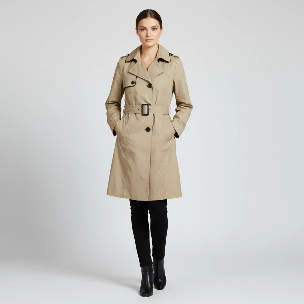 Elején gombos és zsebes, derekán megkötős átmeneti női kabát