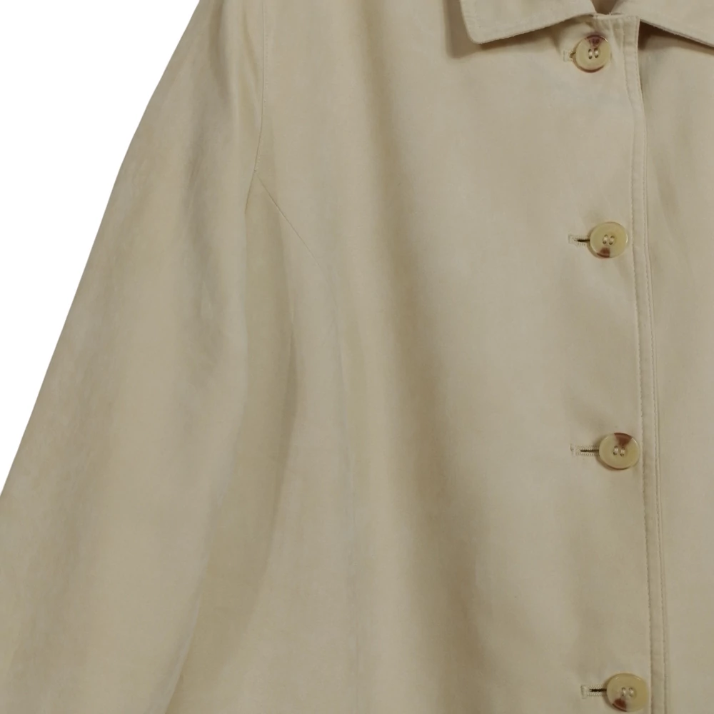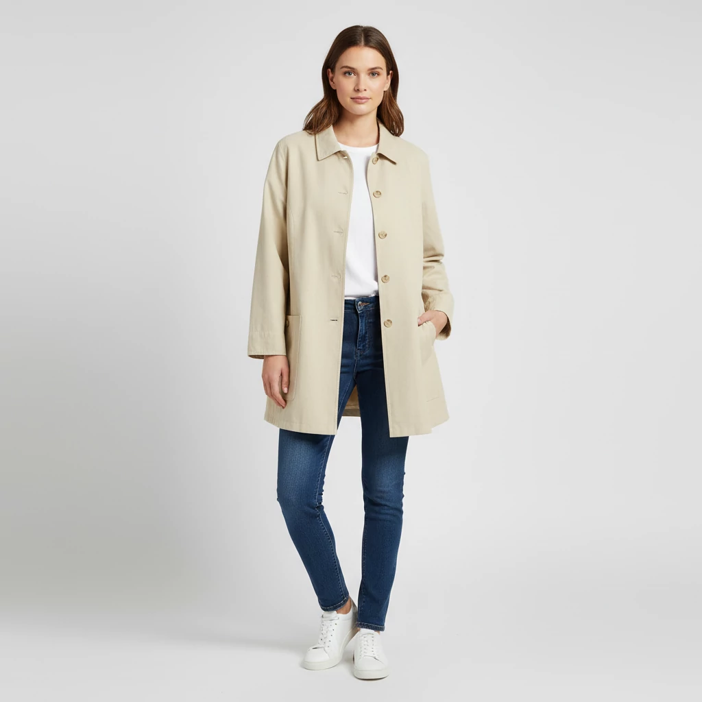 Elején gombos és zsebes, velúrtapintású átmeneti női kabát