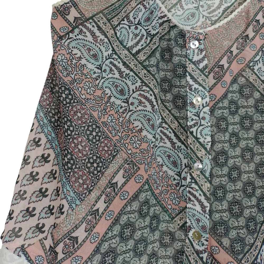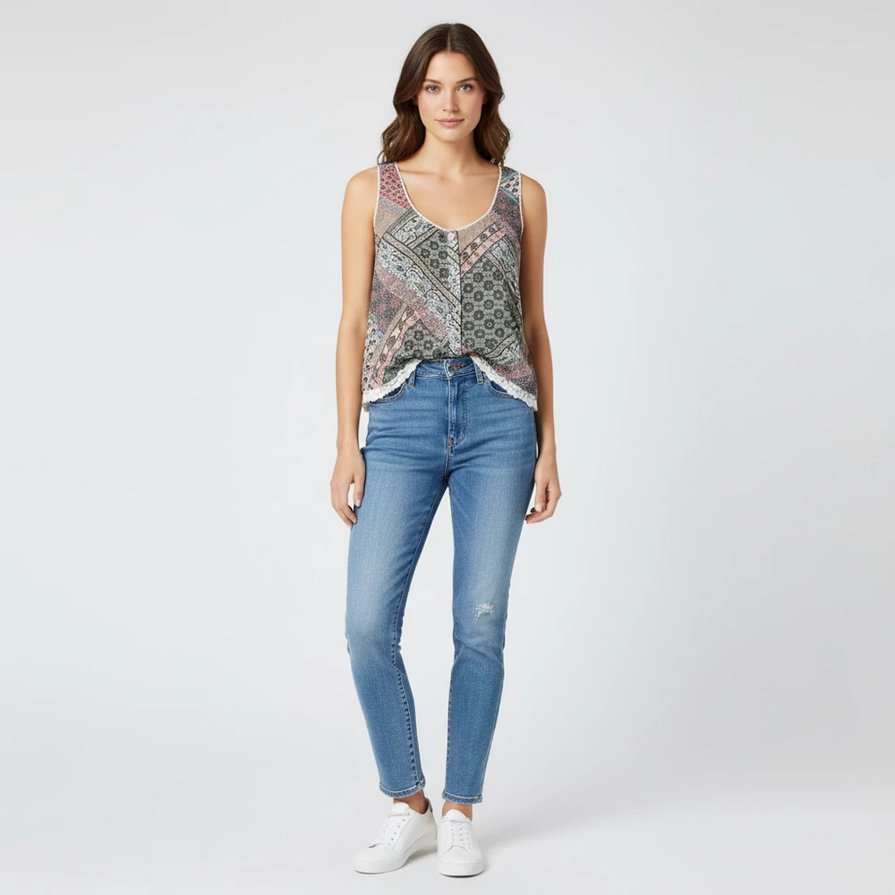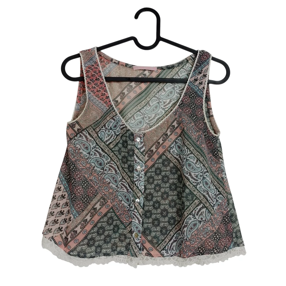 Spagettipántos, alján aszimmetrikus kialakítású, anyagában mintás női felső
