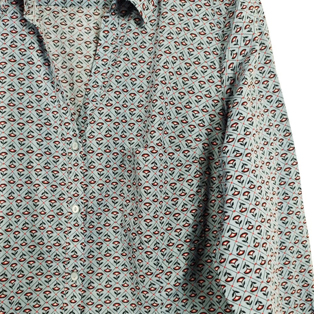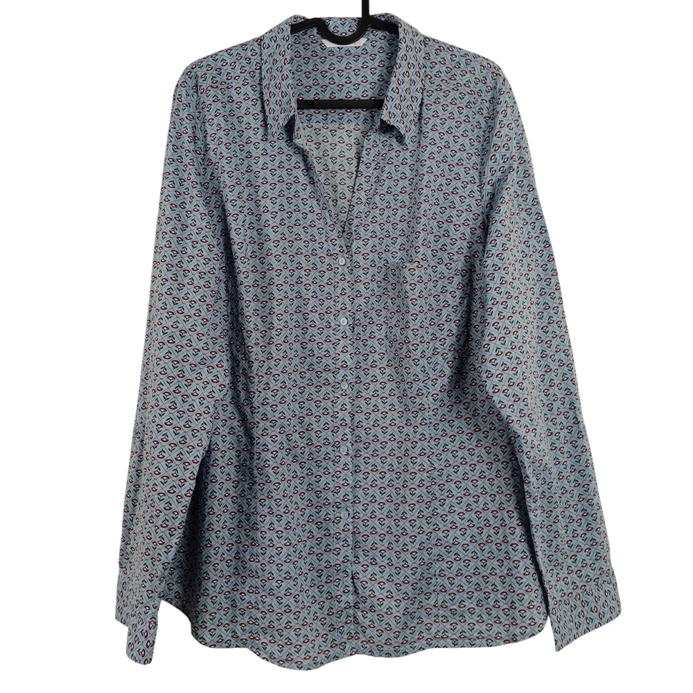 Mellrészén gombos, alján oldalt hosszított, mintás női felső