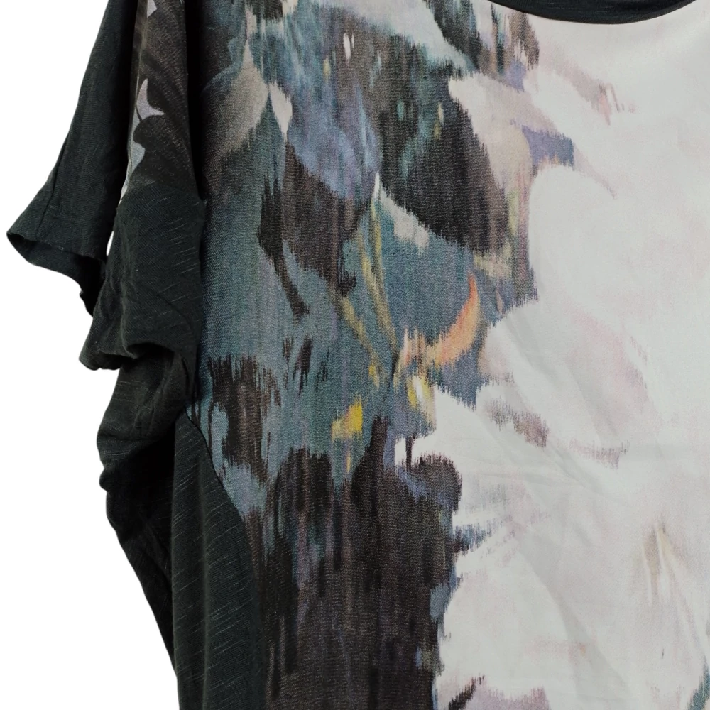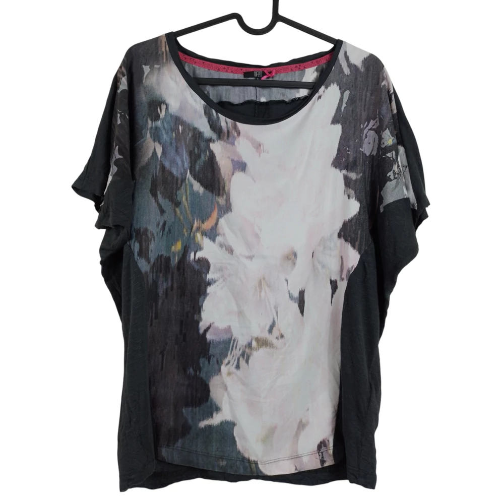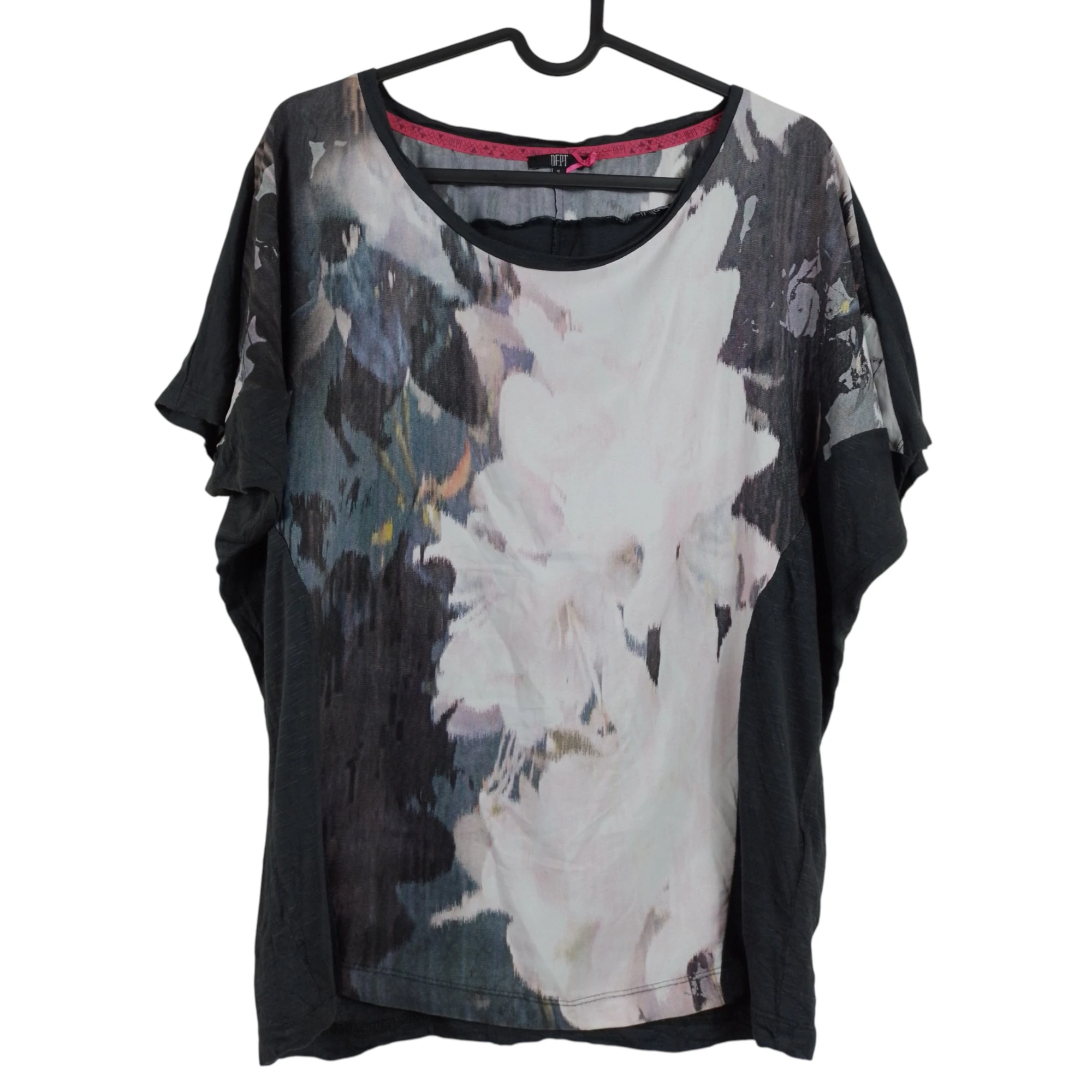 Mellrészén gombos, alján oldalt hosszított, mintás női felső