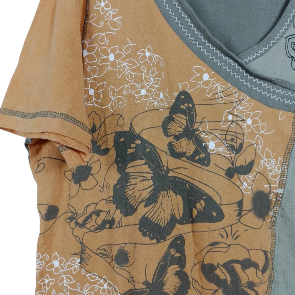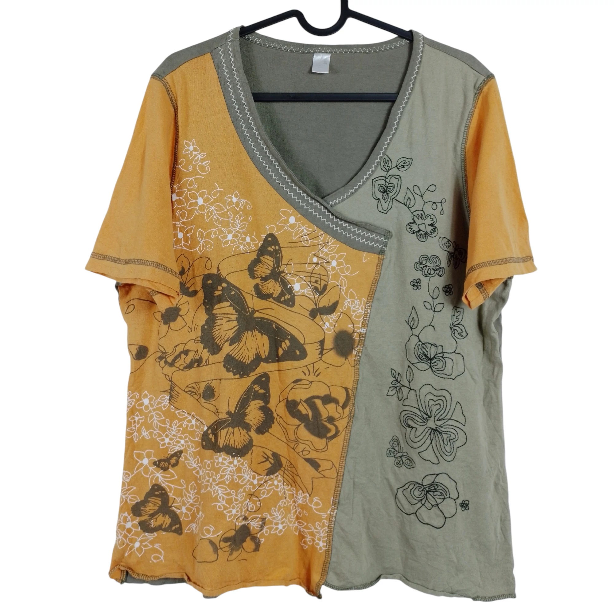 Mellrészén gombos, alján oldalt hosszított, mintás női felső