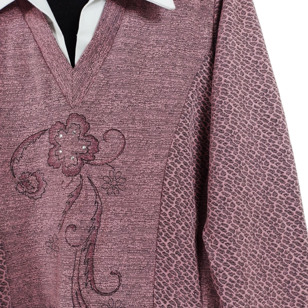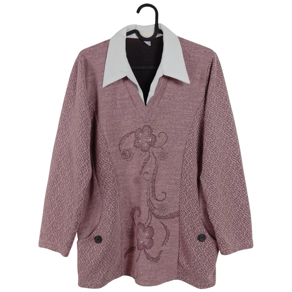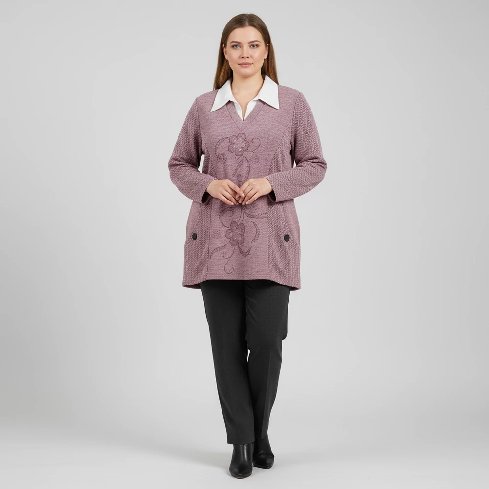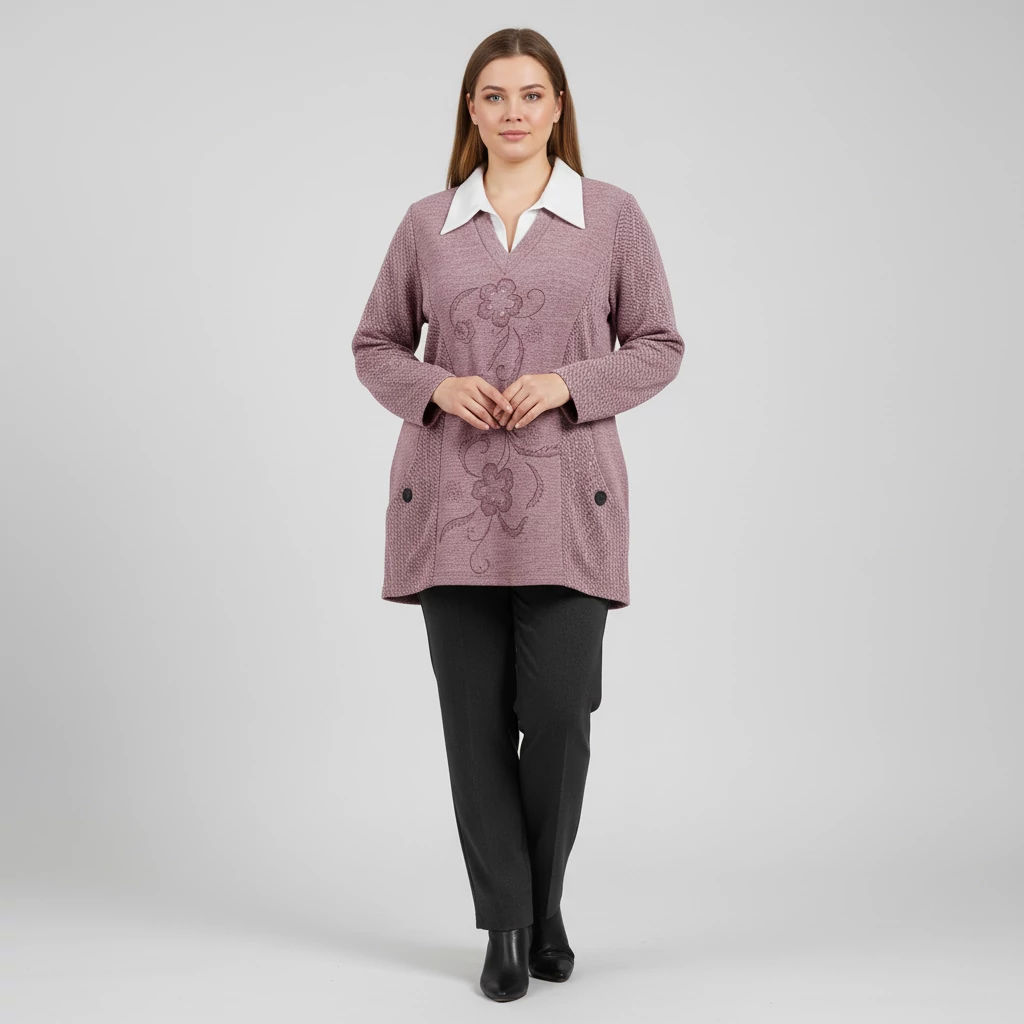 Mellrészén gombos, alján oldalt hosszított, mintás női felső