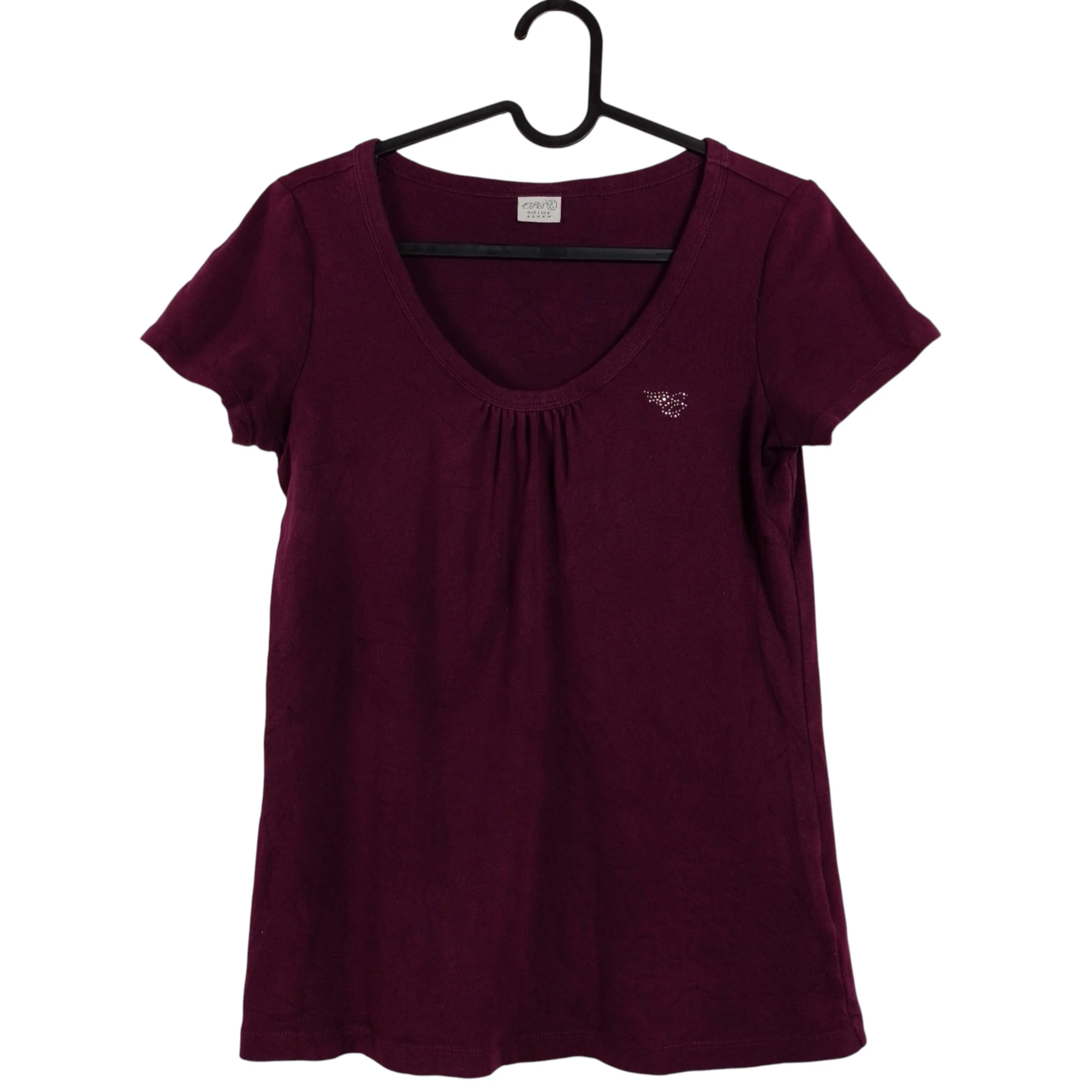 Elején ejtett anyagú, egyik oldalán húzott varrású, mintás női felső