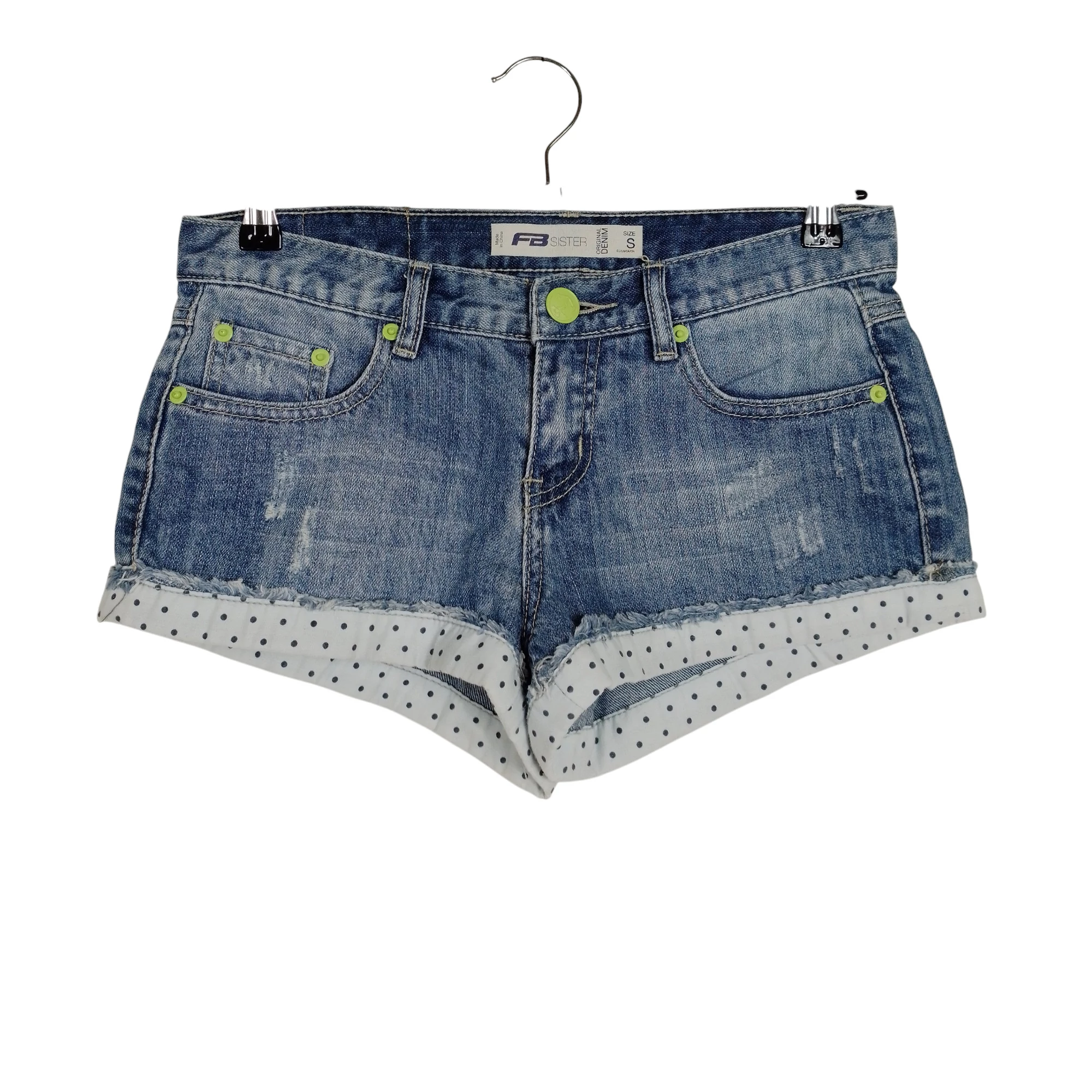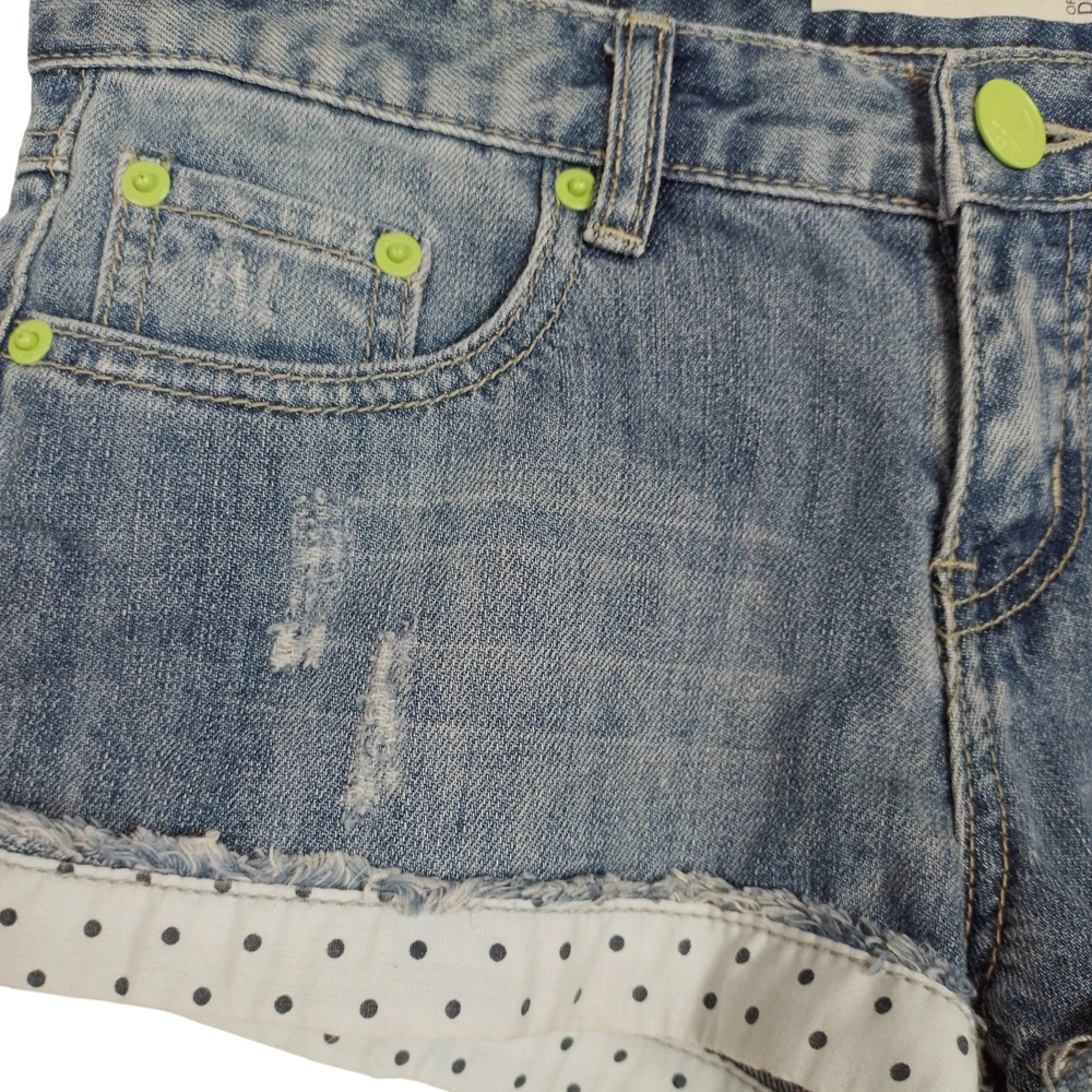 Szára alján rojtos, koptatott, hímzéssel díszített női farmer rövidnadrág