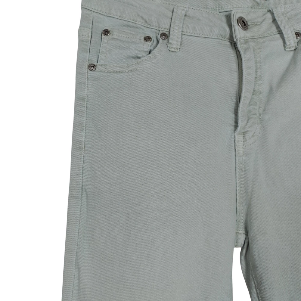 Elől hátul zsebes, zsebén fém elemekkel díszített, koptatott női farmer rövidnadrág