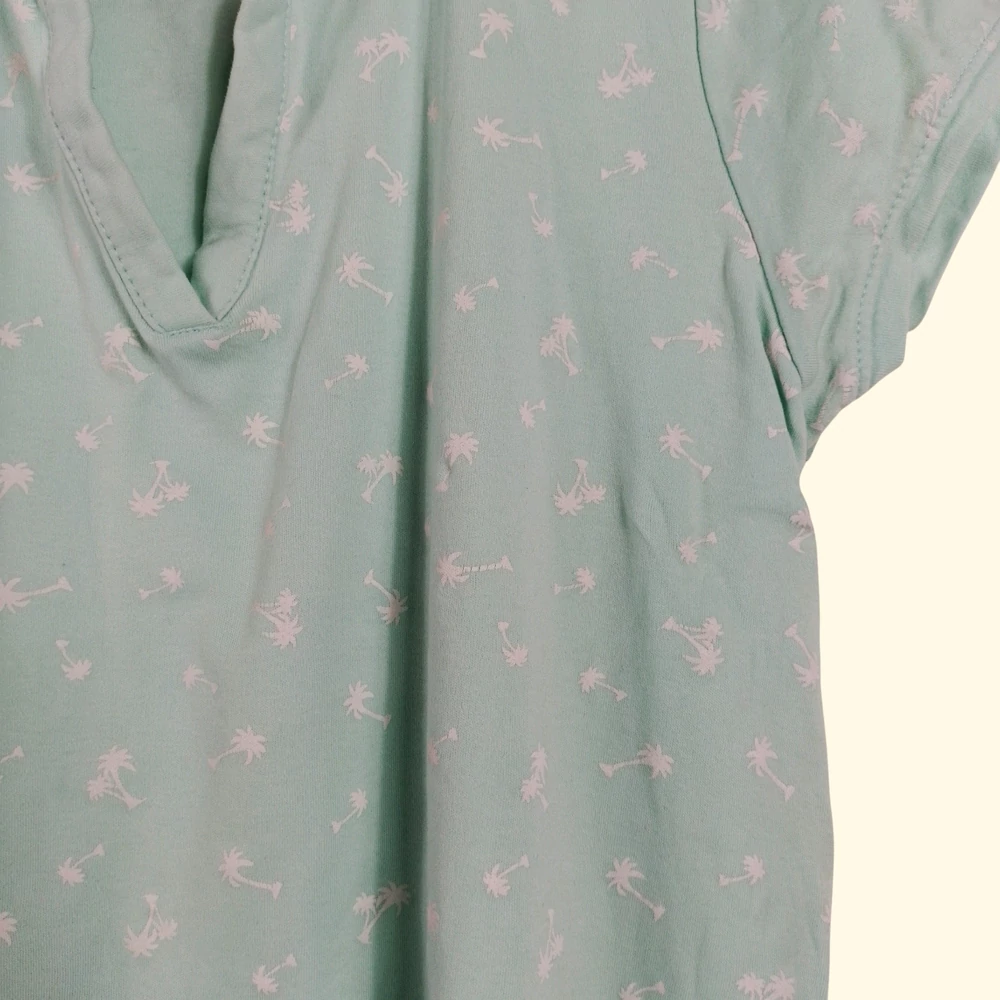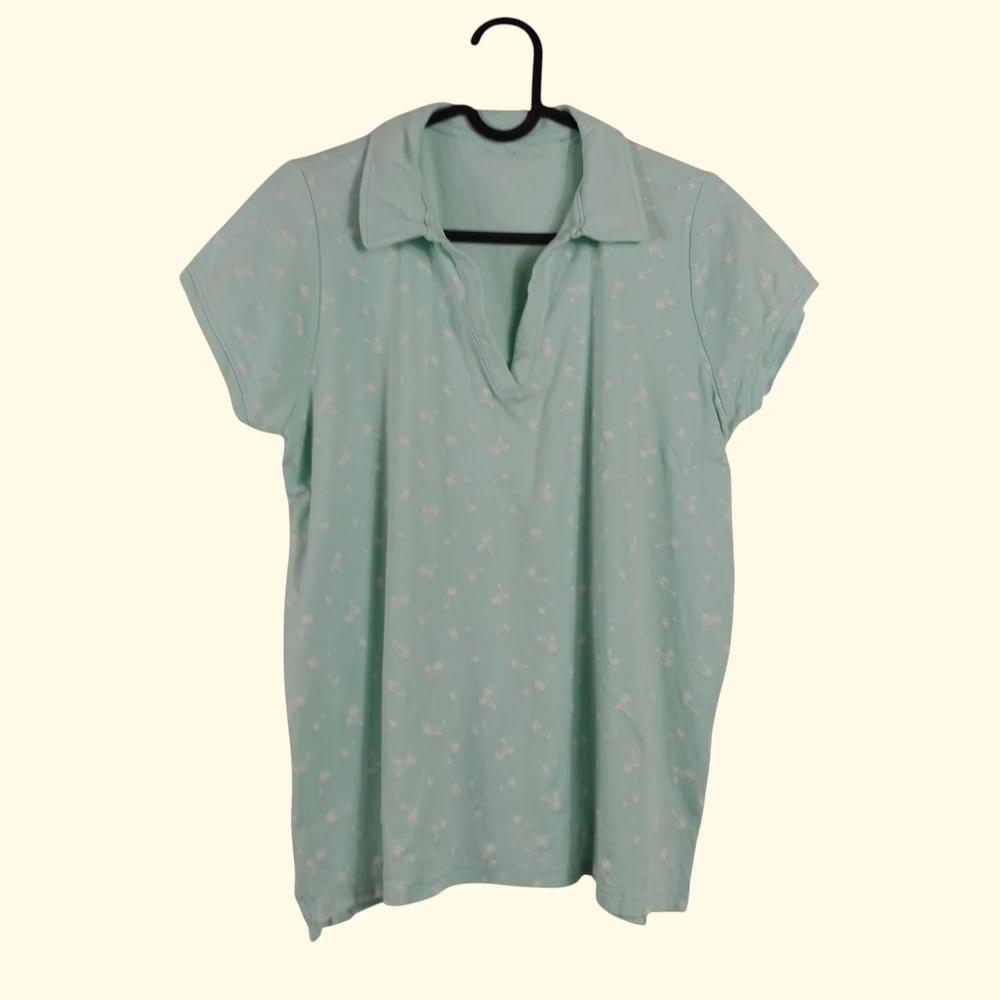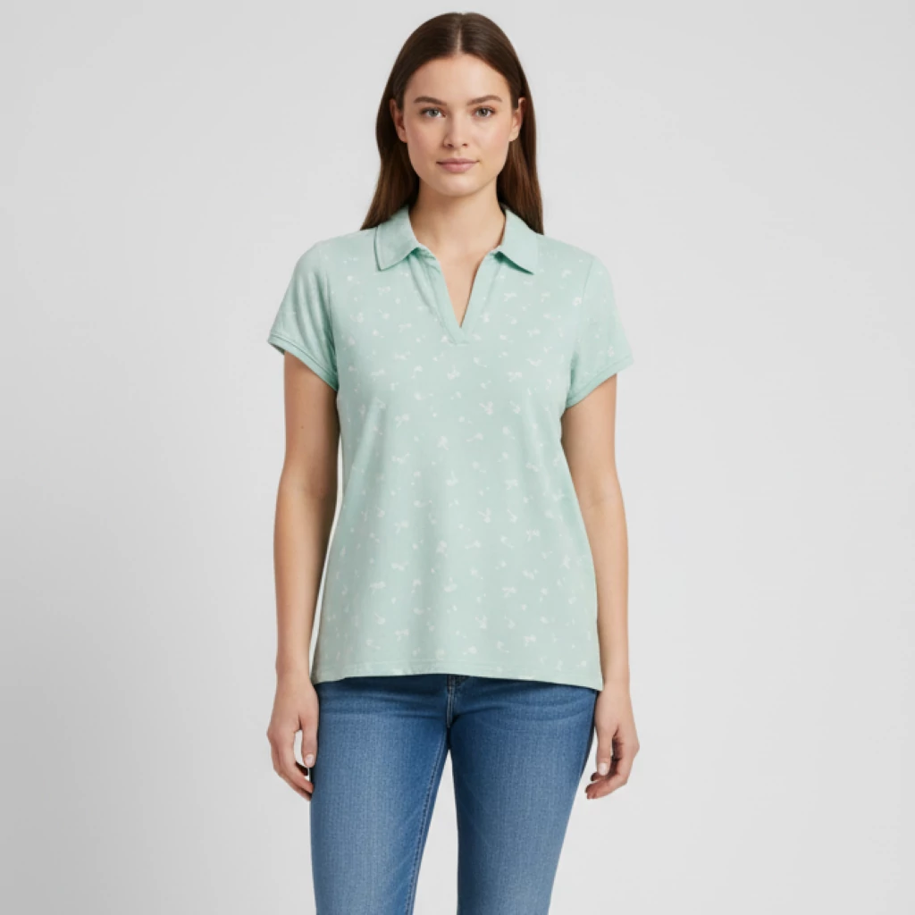 Mellrészén gombos, alján oldalt hosszított, mintás női felső
