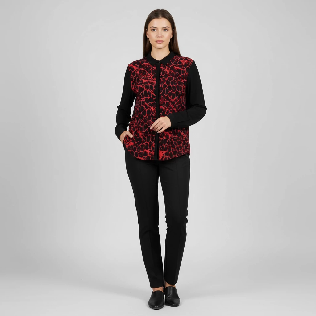 Elején gombos, galléros, alján fodros női felső