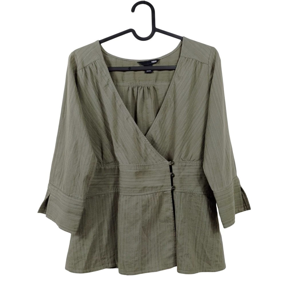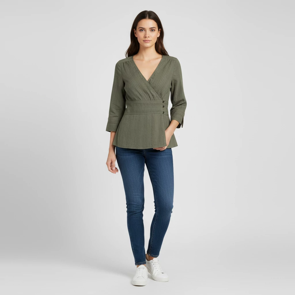 Elején ejtett anyagú, egyik oldalán húzott varrású, mintás női felső