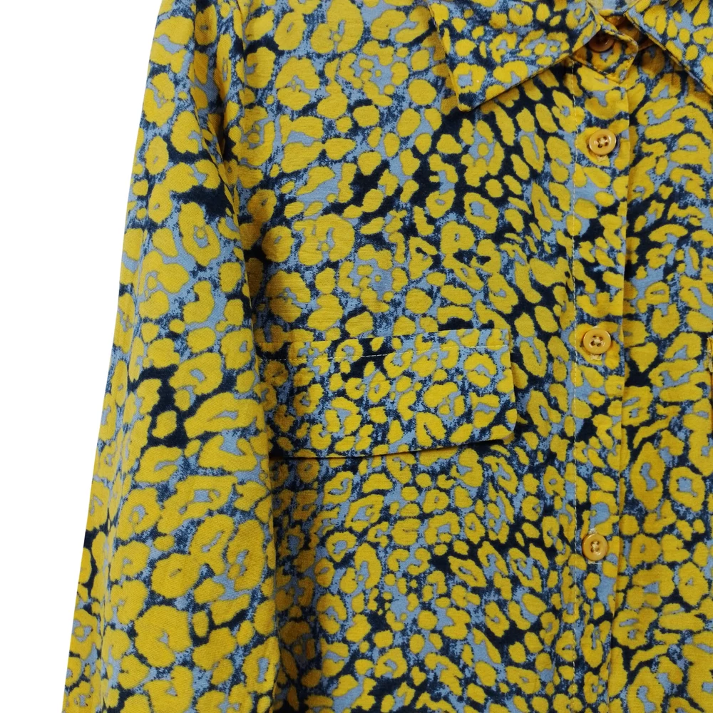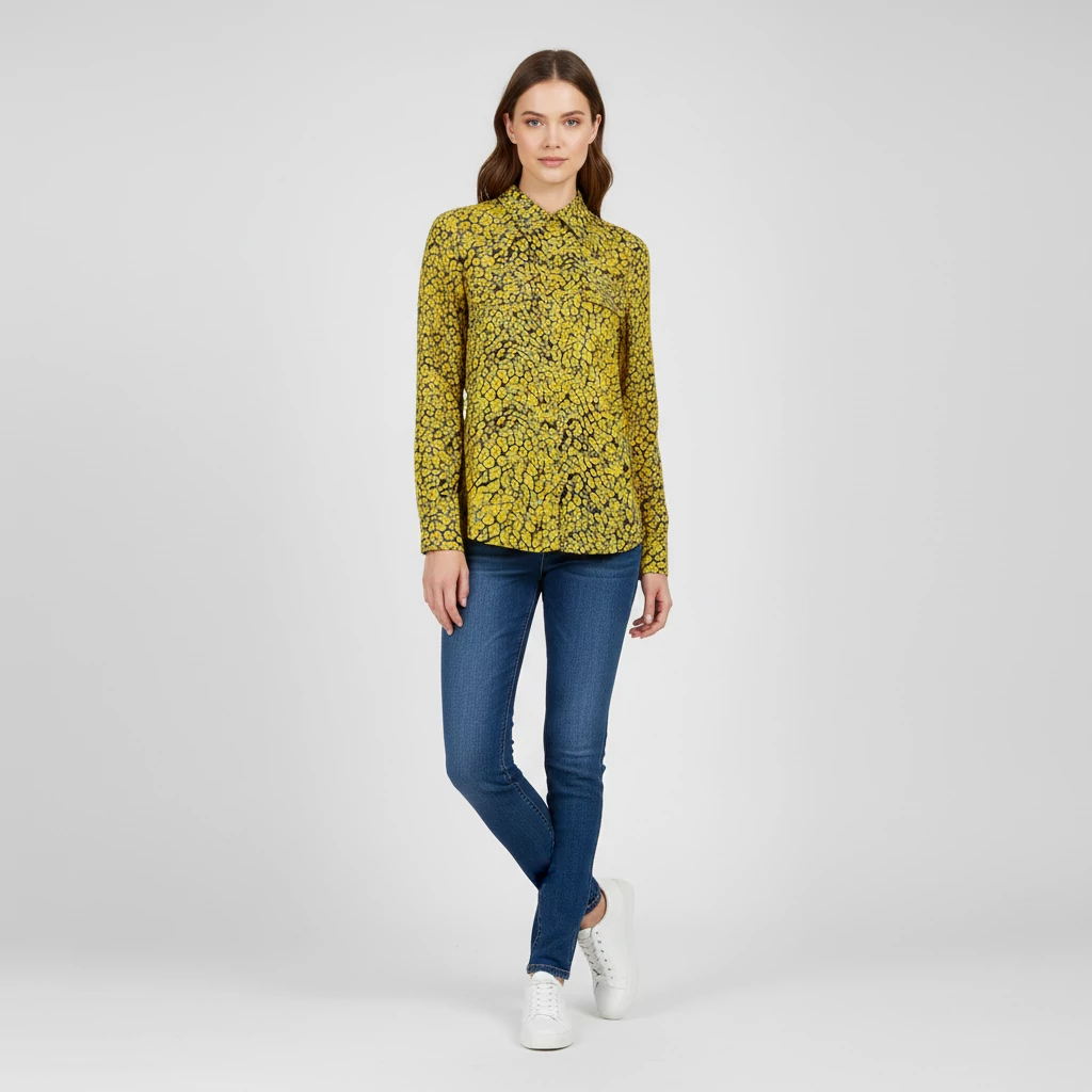 Elején ejtett anyagú, egyik oldalán húzott varrású, mintás női felső