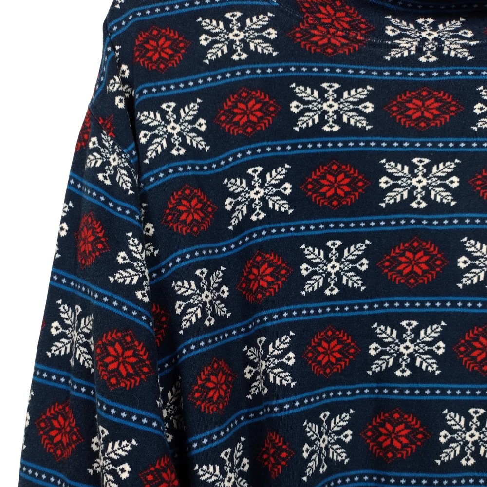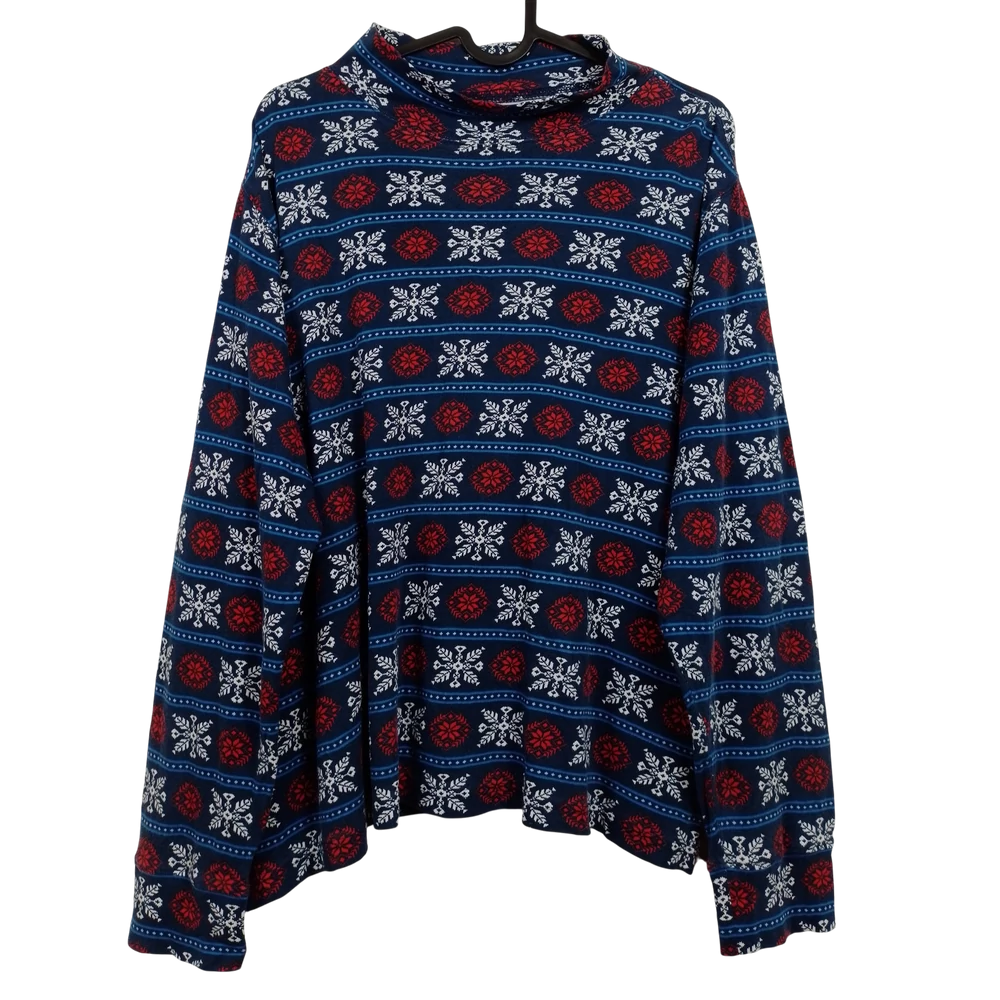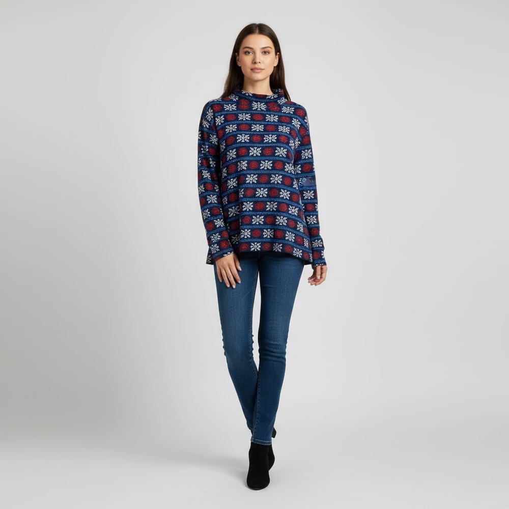 Mellrészén gombos, alján oldalt hosszított, mintás női felső