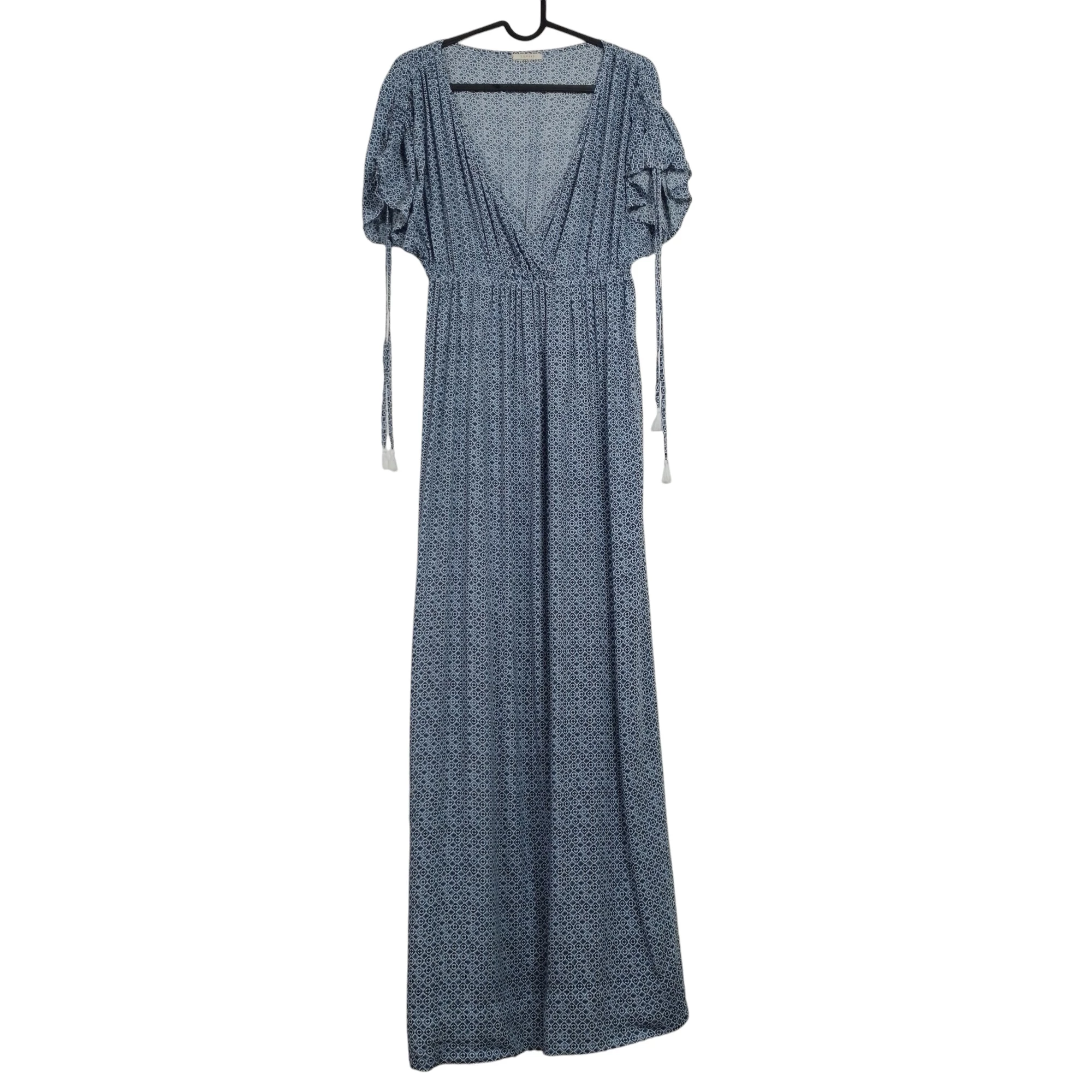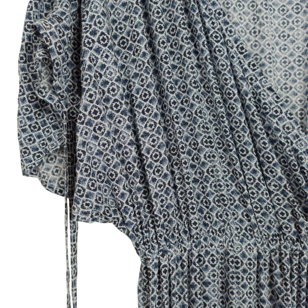 Elején nyitott, mellrészén megkötős, mintás női egész ruha