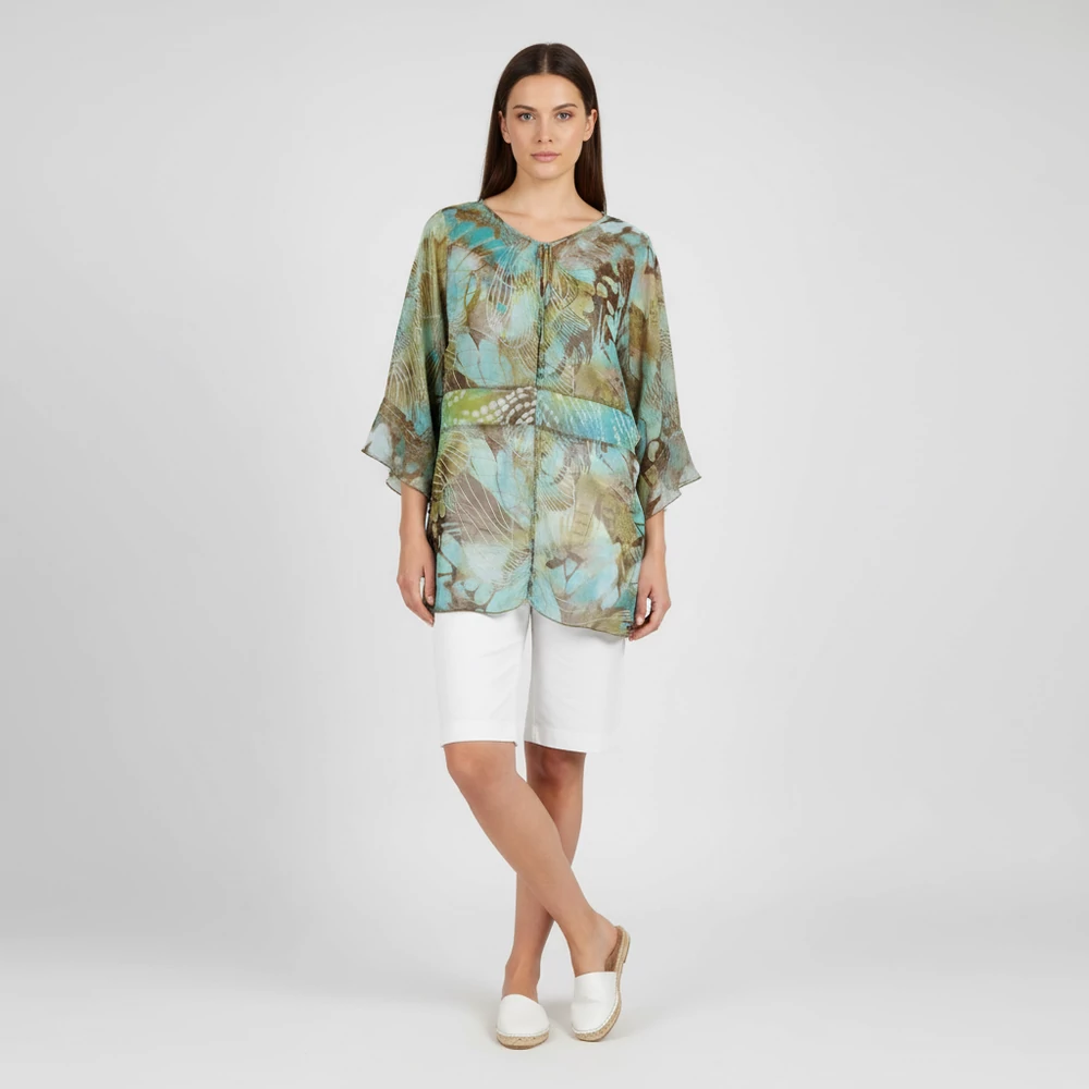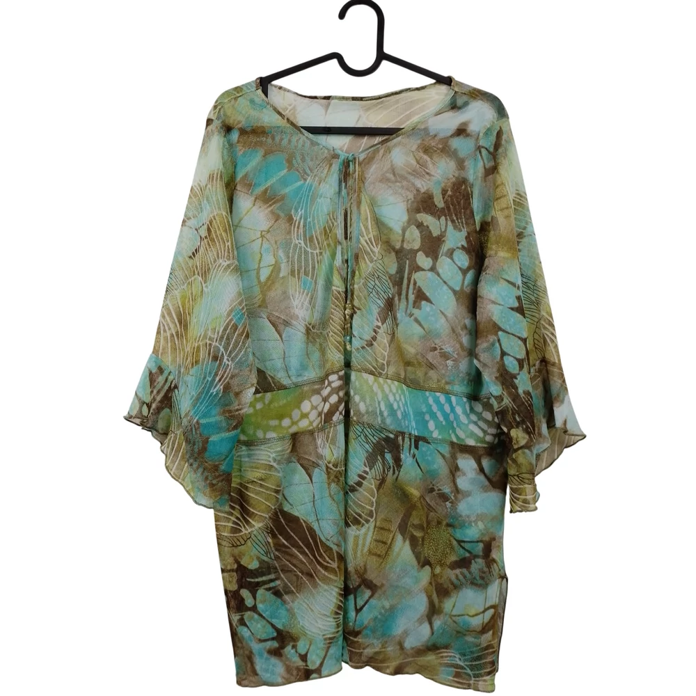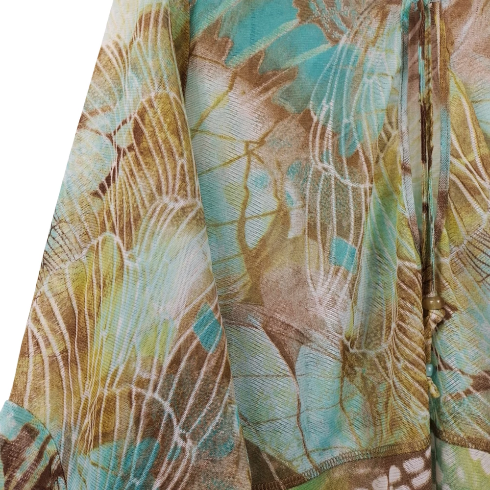 Mellrészén gombos, alján oldalt hosszított, mintás női felső