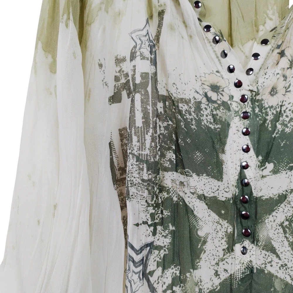 Nyakrészén flitterrel díszített, ujján hasított női felső