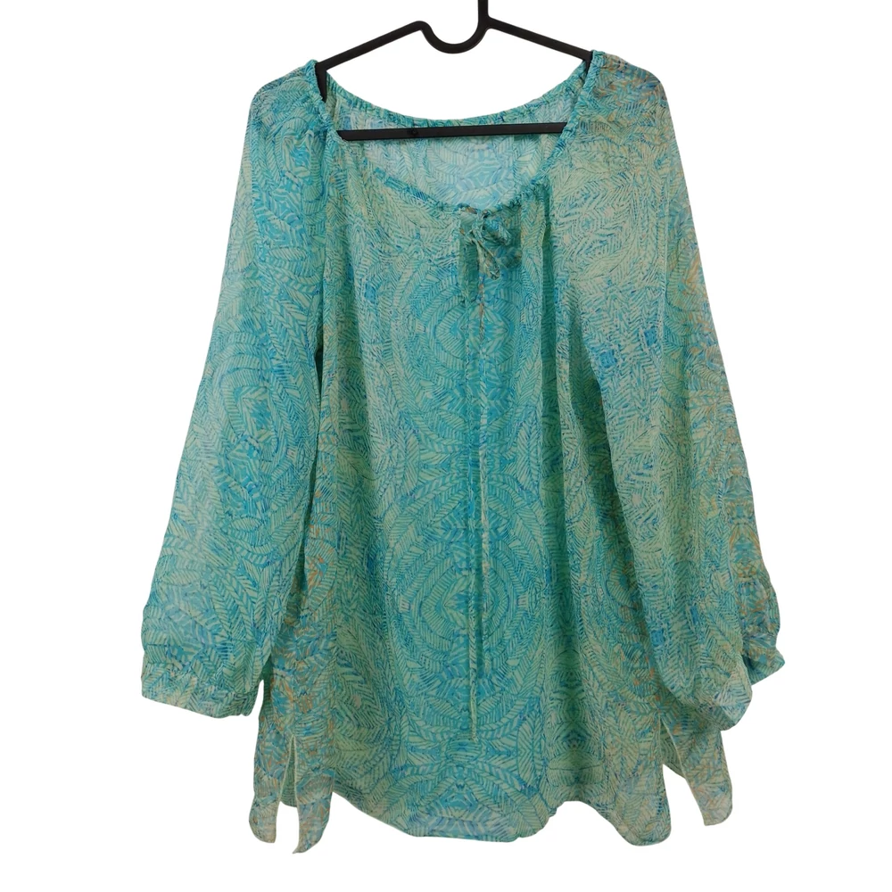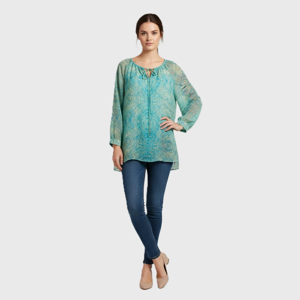 Mellrészén gombos, alján oldalt hosszított, mintás női felső