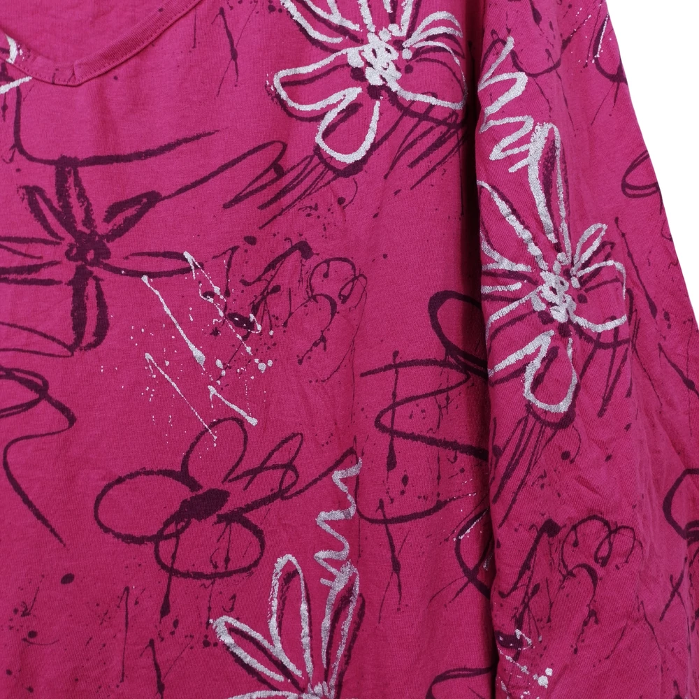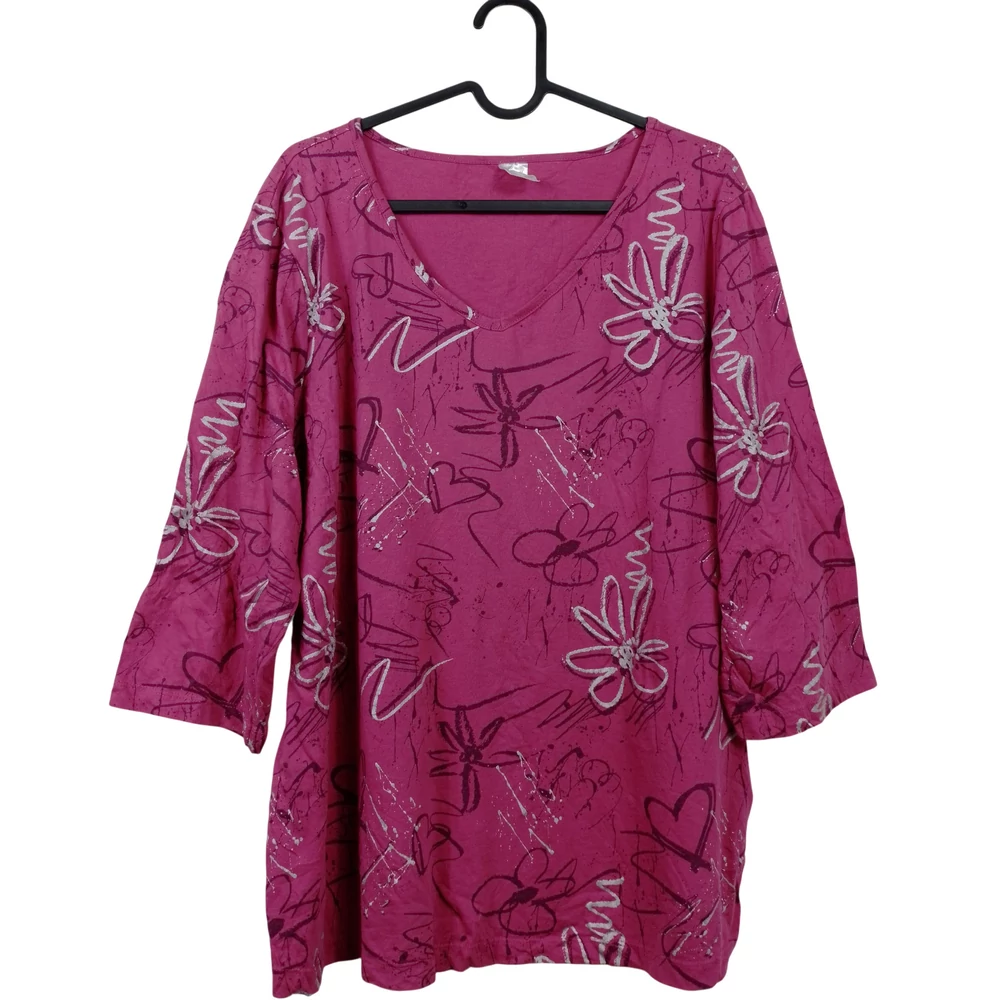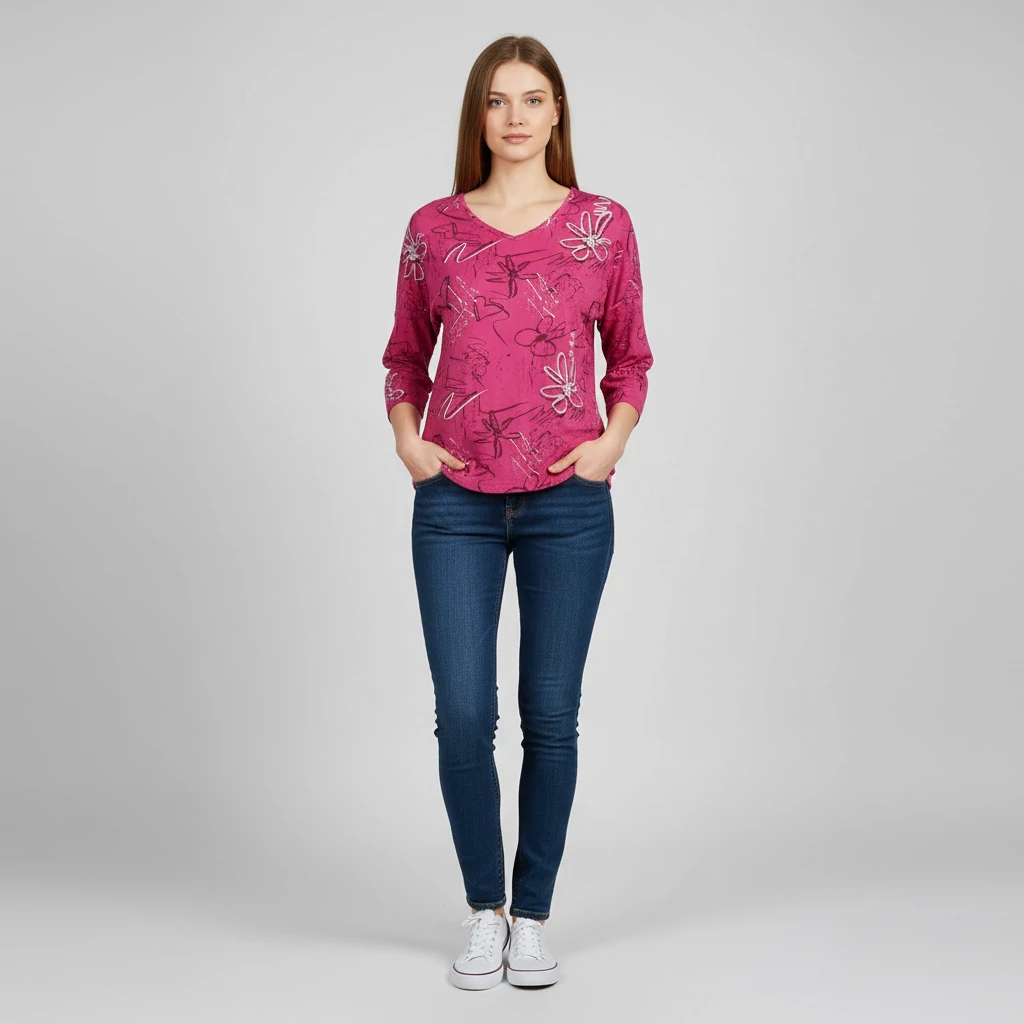 Mellrészén gombos, alján oldalt hosszított, mintás női felső