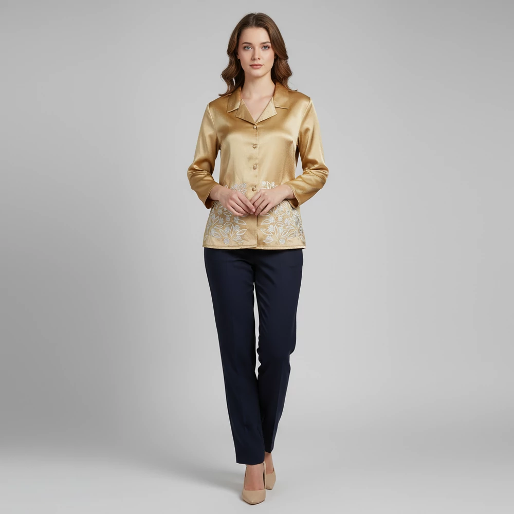 Egyedi jellemző(k): elején gombos, alján hímzéssel díszített, aranyszínű