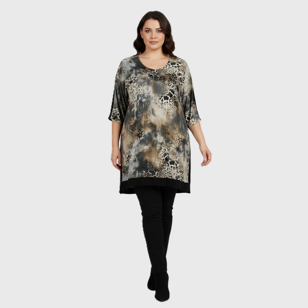 Hátulján hosszított, bőszabású női felső