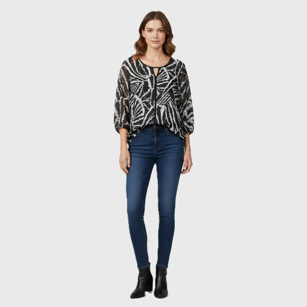 Mellrészén gombos, alján oldalt hosszított, mintás női felső