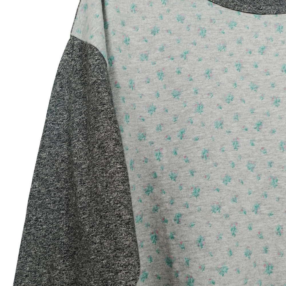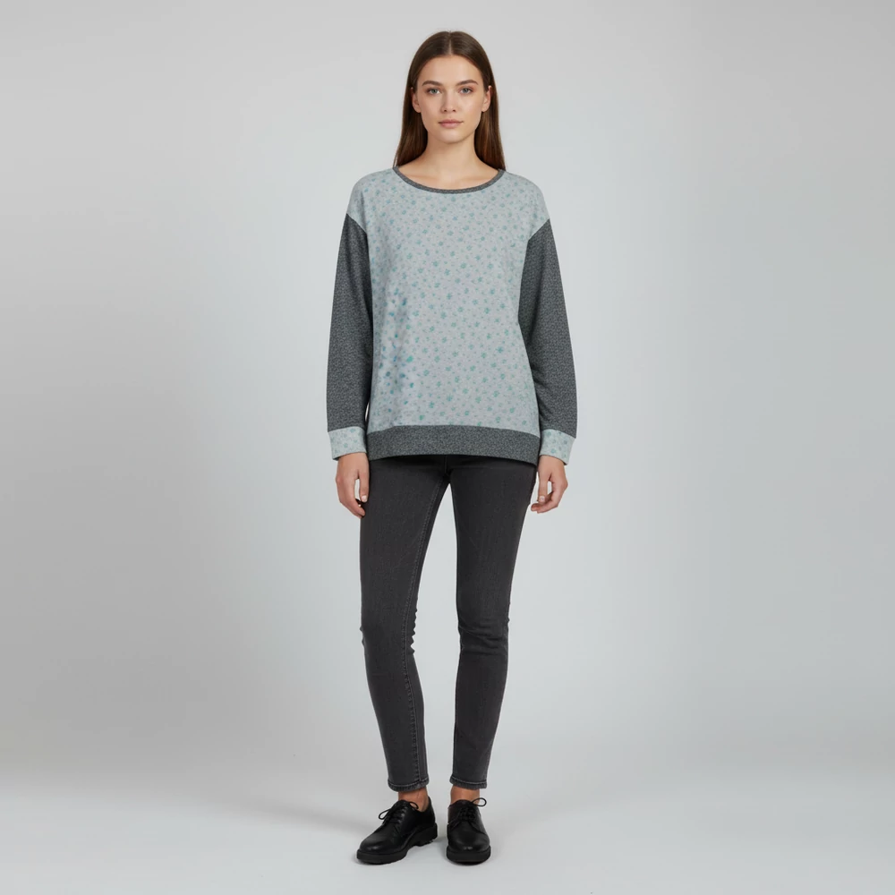 Mellrészén gombos, alján oldalt hosszított, mintás női felső