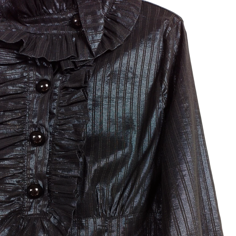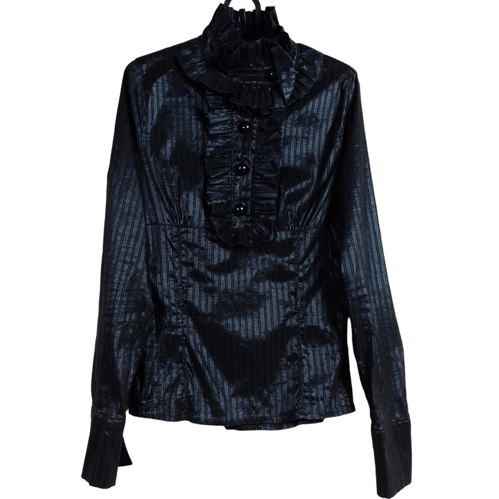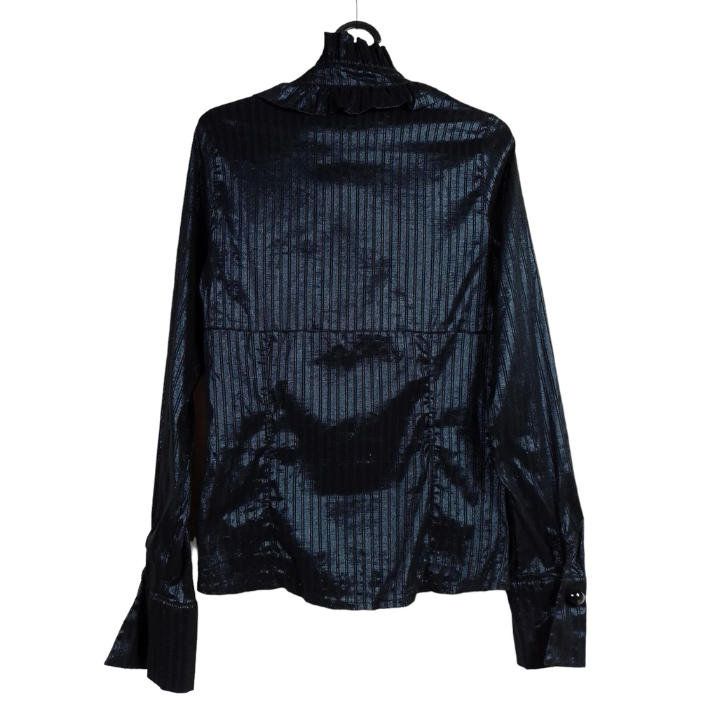 Mellrészén gombos, alján oldalt hosszított, mintás női felső