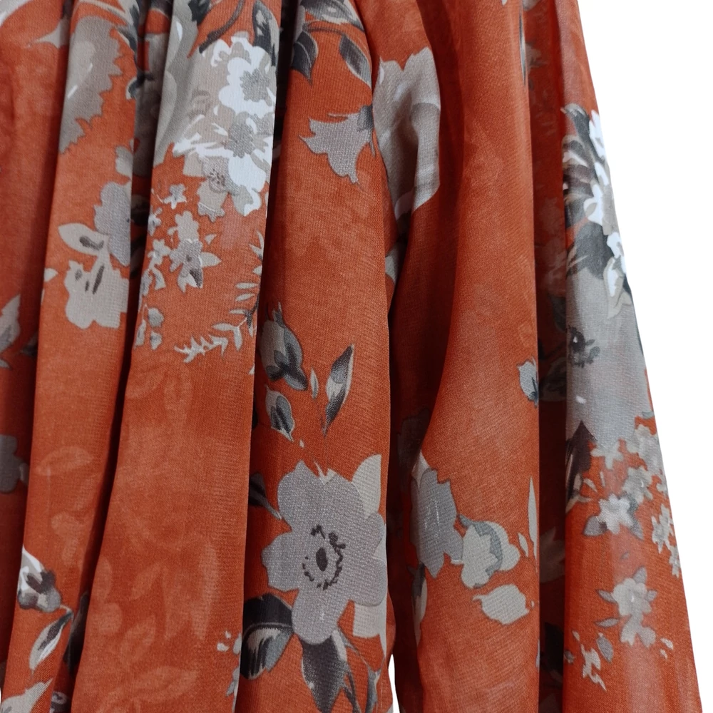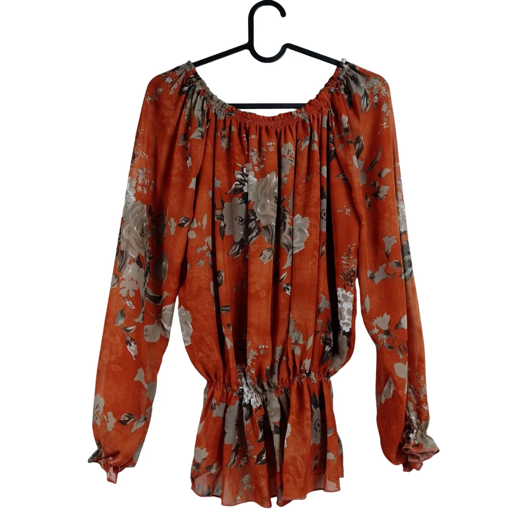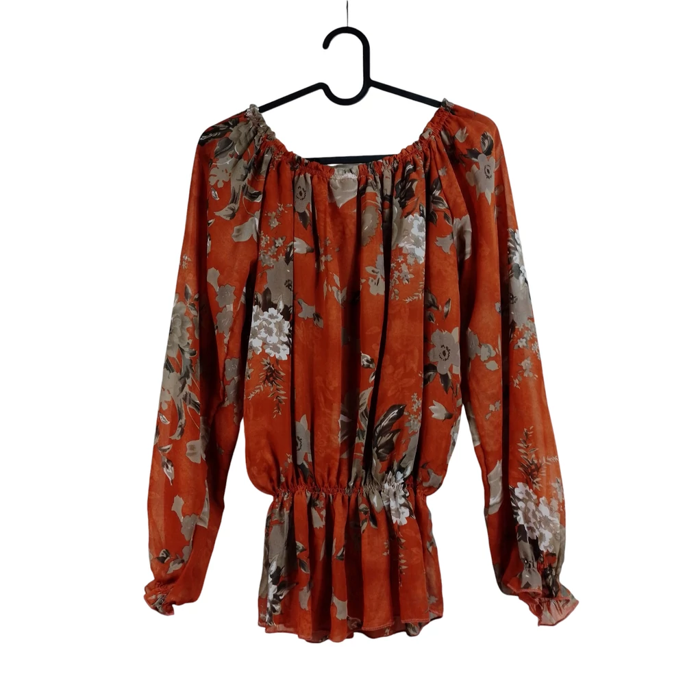 Virágmintás, derékrészén gumis, mellrészén fodros női felső