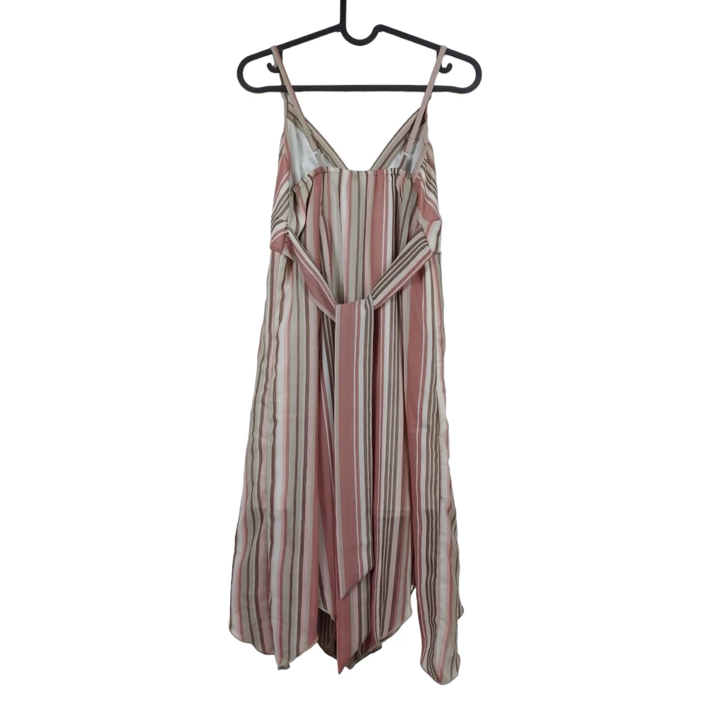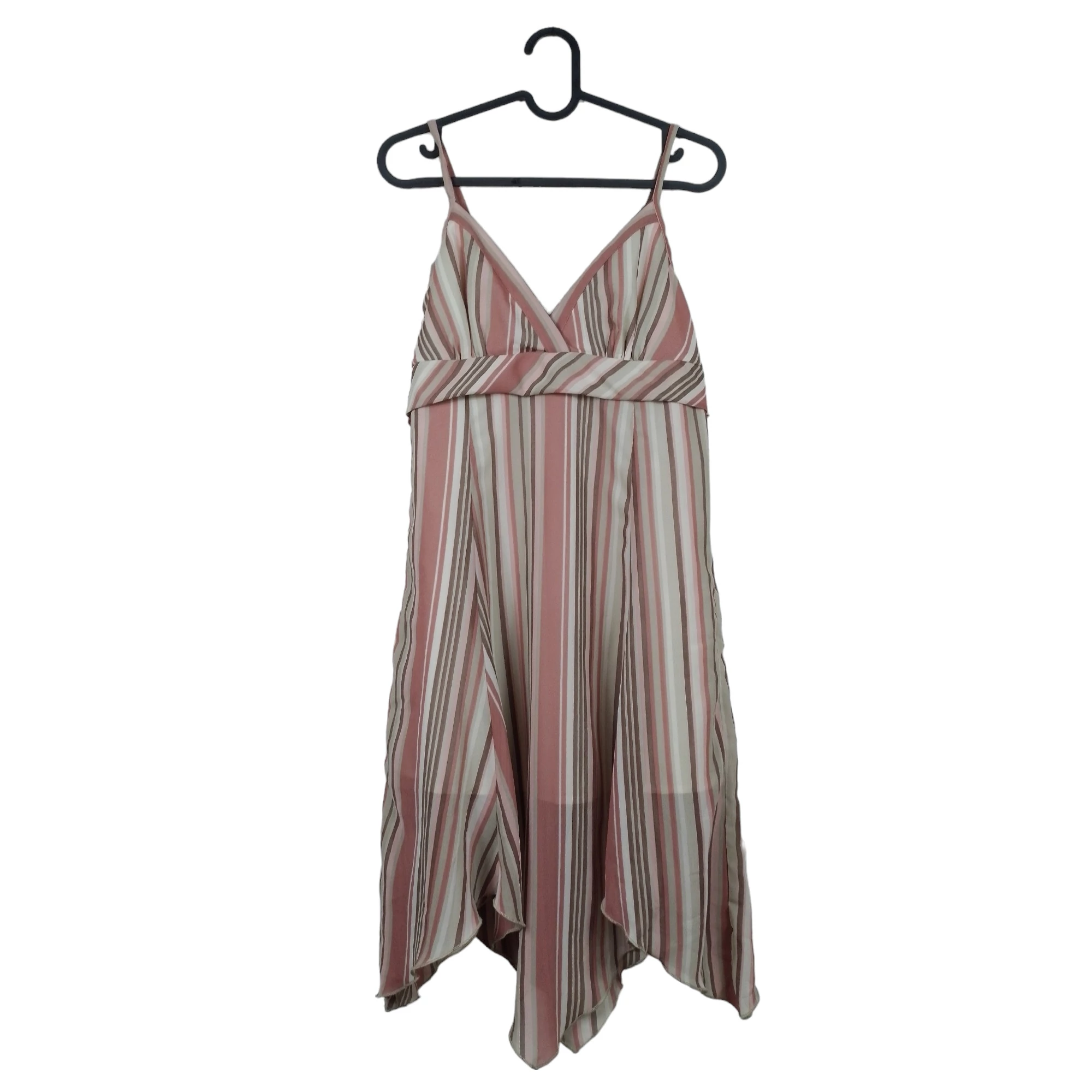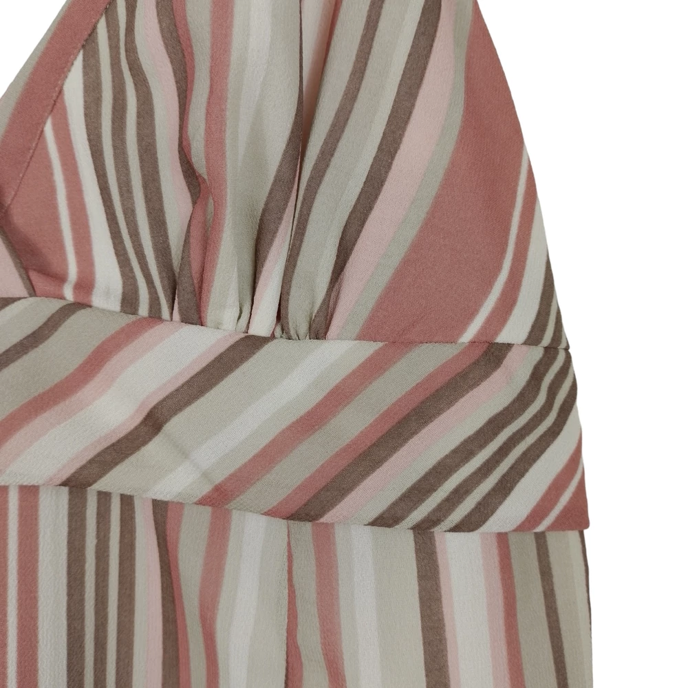 Mellrészén átlapolt, derekán gumis, bőszárú (nadrág), csíkos női ruha