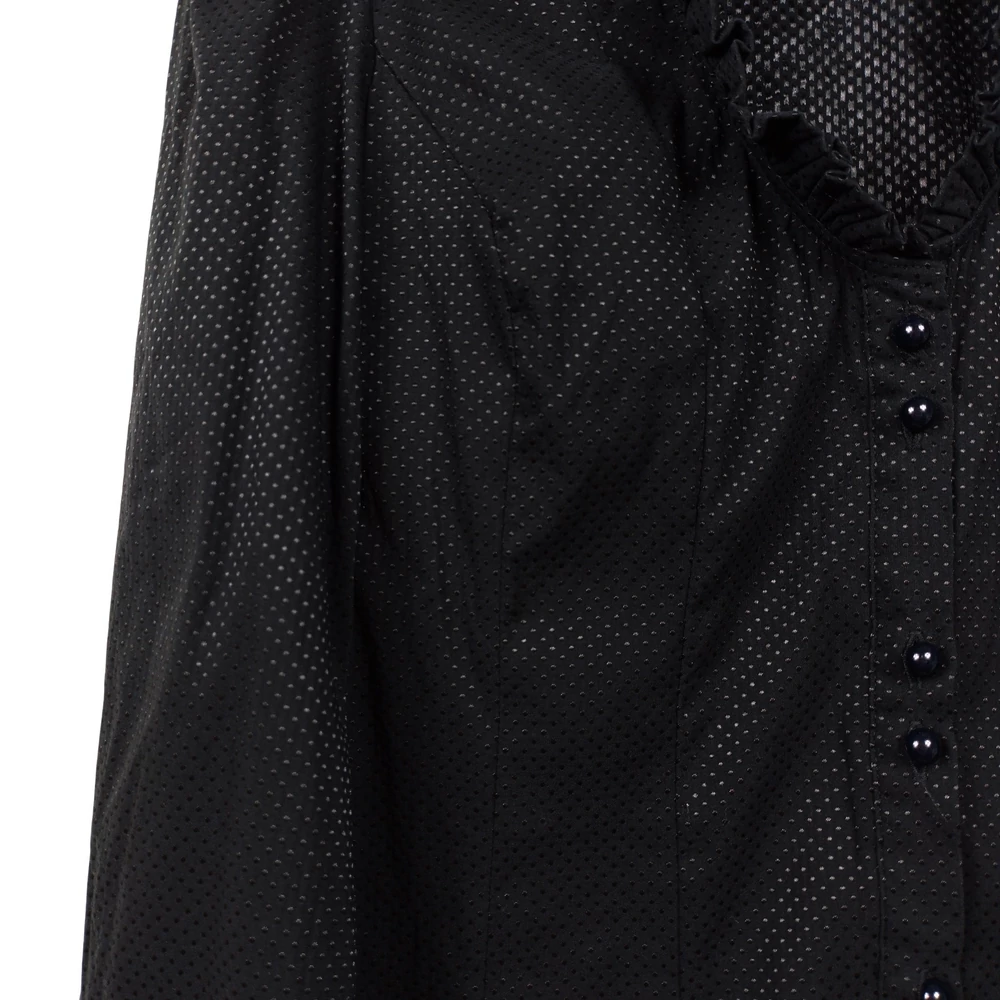 Gallérján gyönggyel díszített, derekán övbújtatós női felső