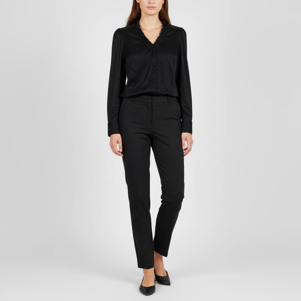 Mellrészét hangsúlyozú, hátul cipzáras, nyakbakötős női felső