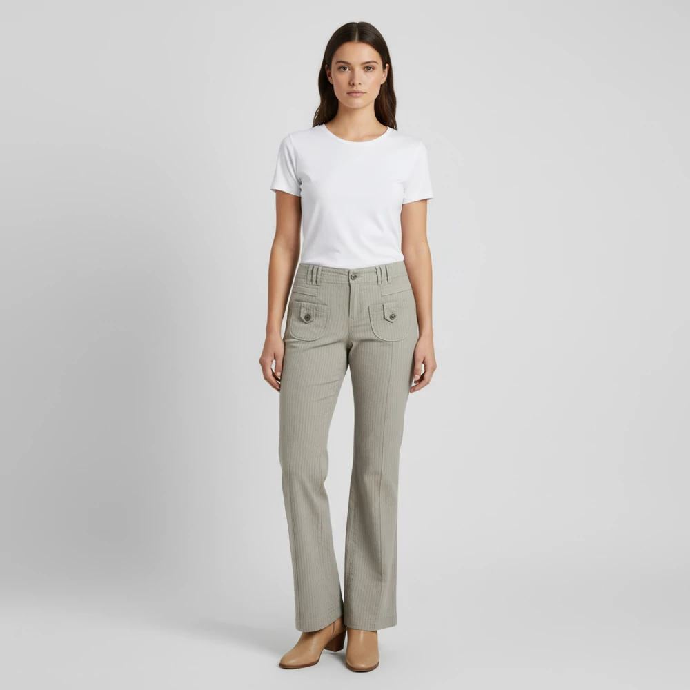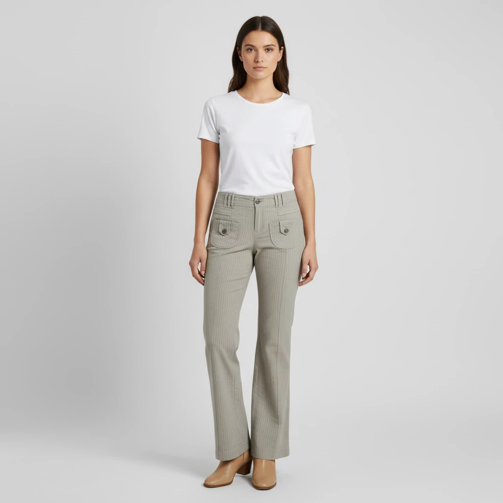Sokzsebes, szárának alsó részén gombokkal díszített női nadrág