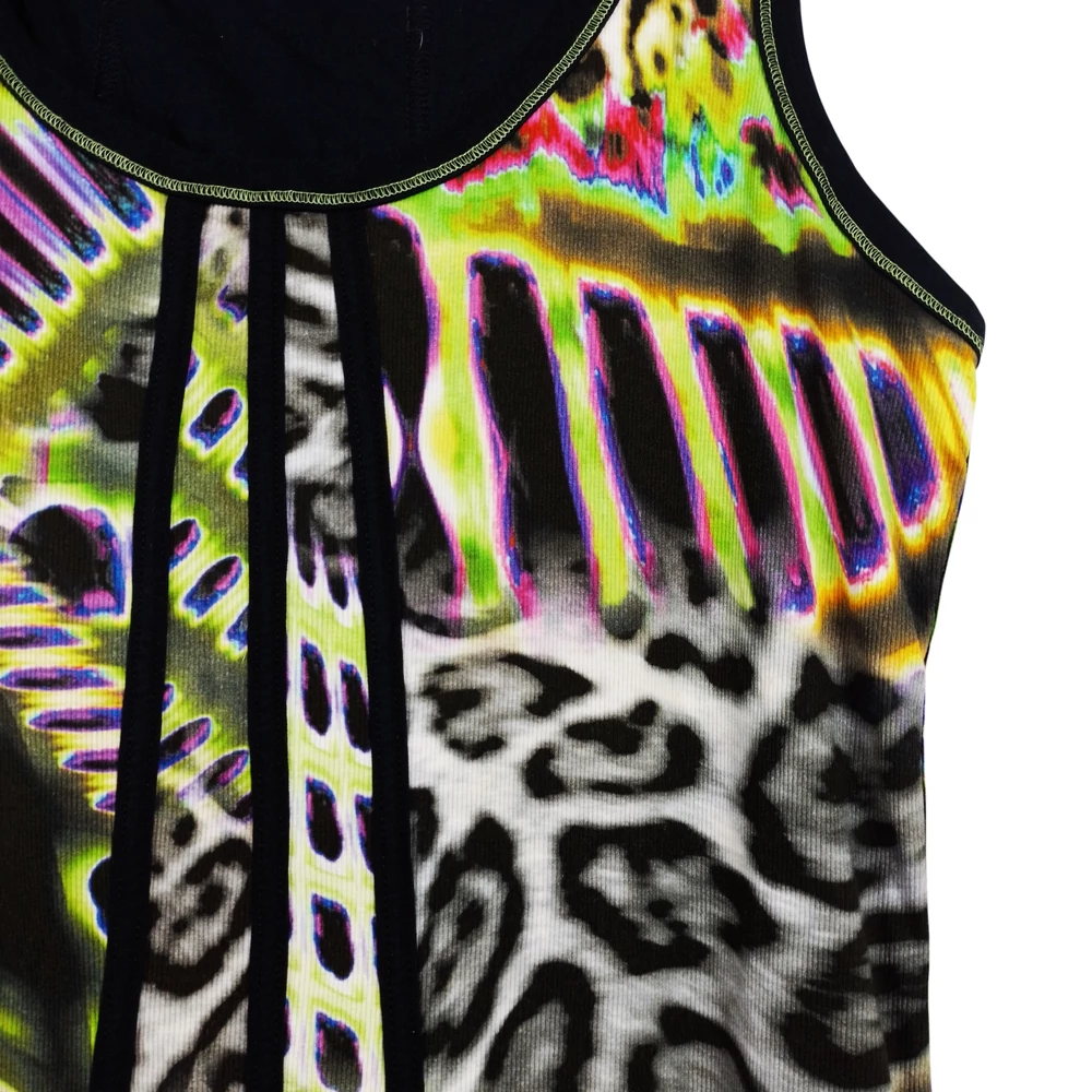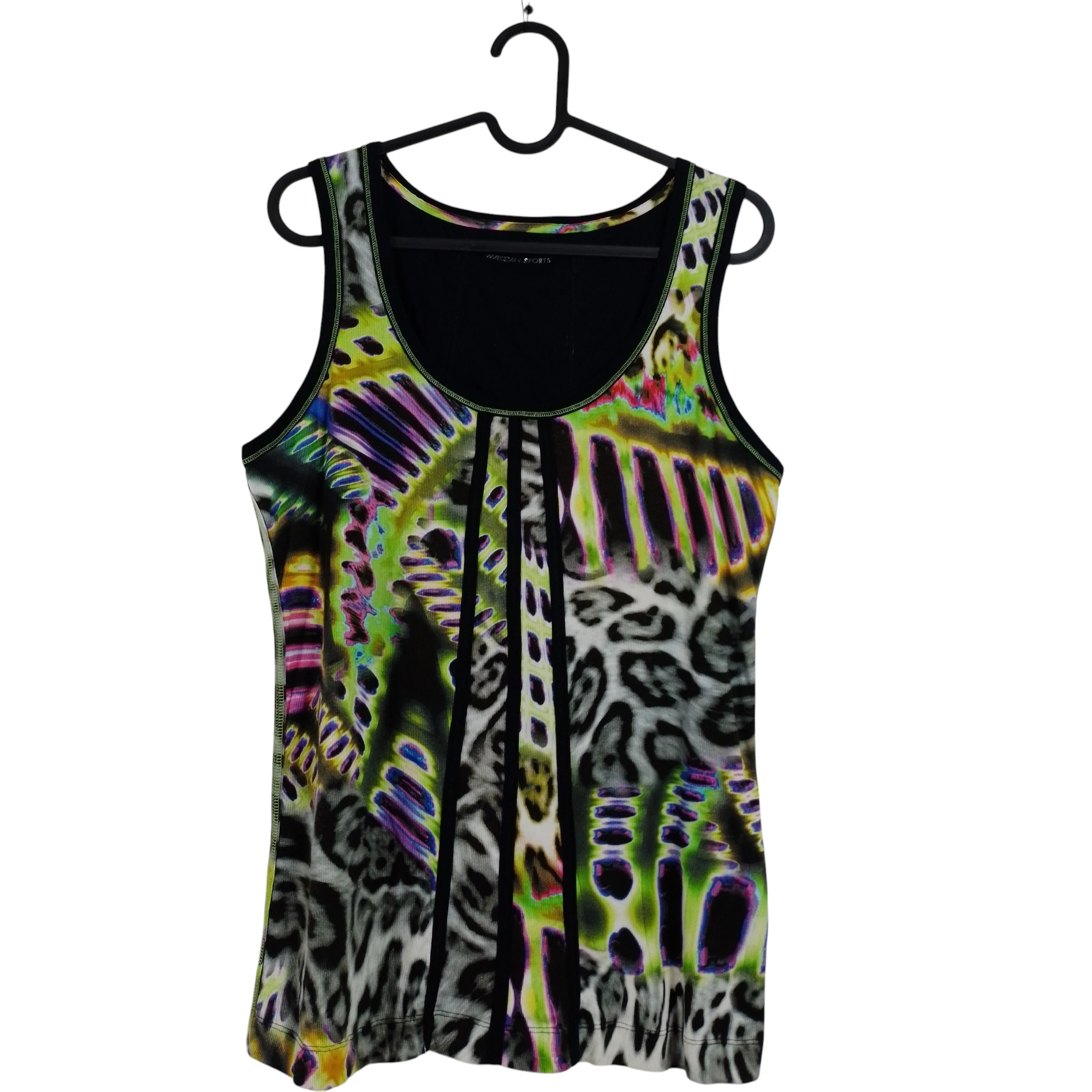 Mellrészén gombos, alján oldalt hosszított, mintás női felső