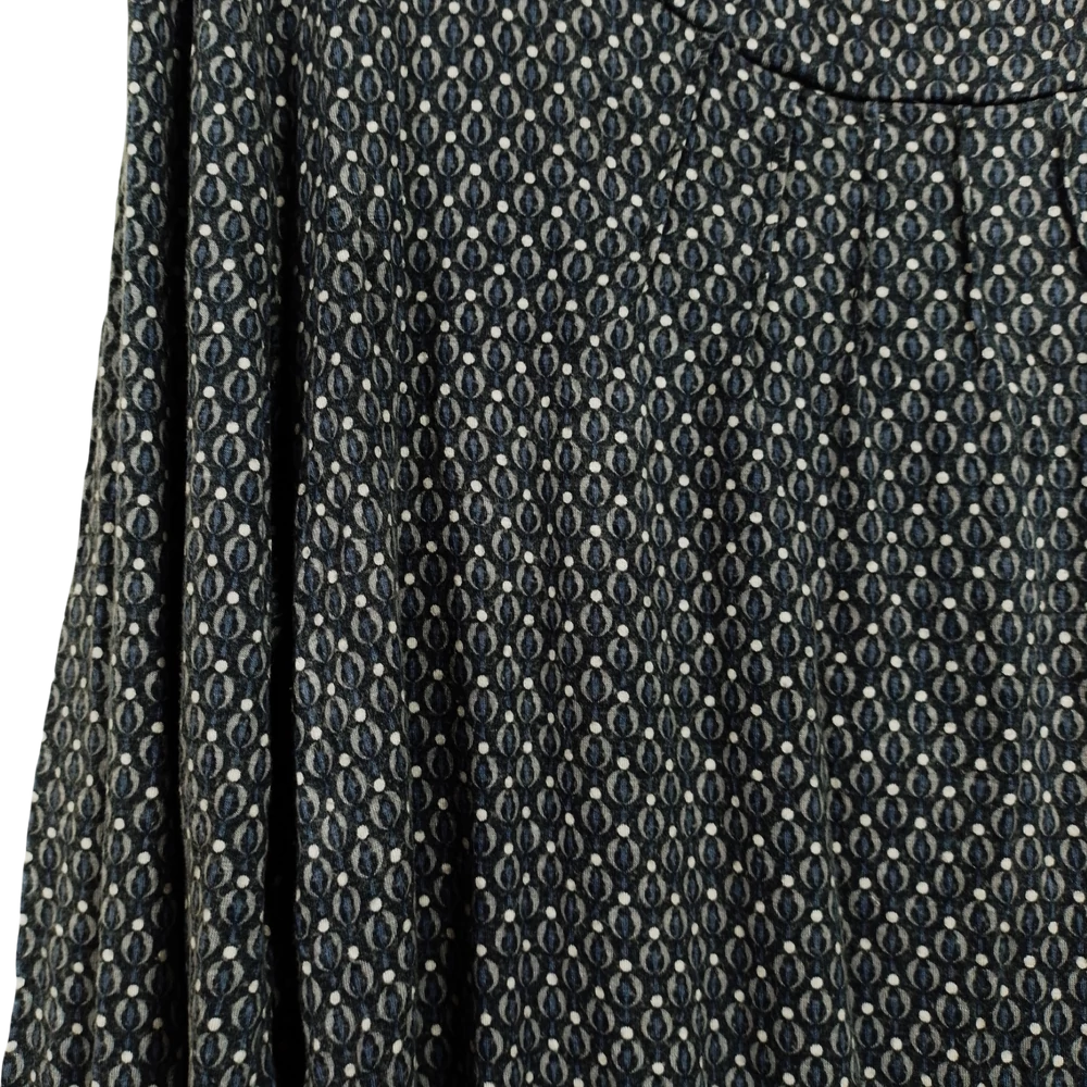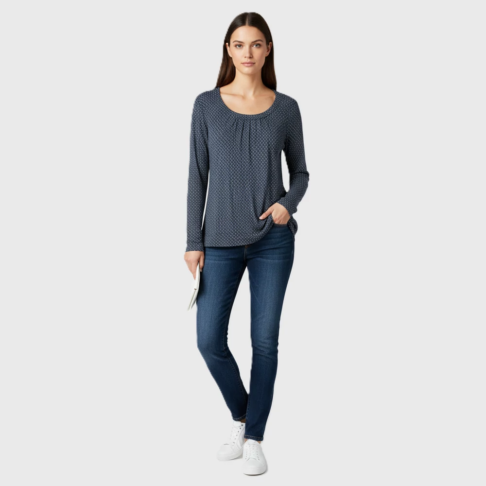 Mellrészén gombos, alján oldalt hosszított, mintás női felső