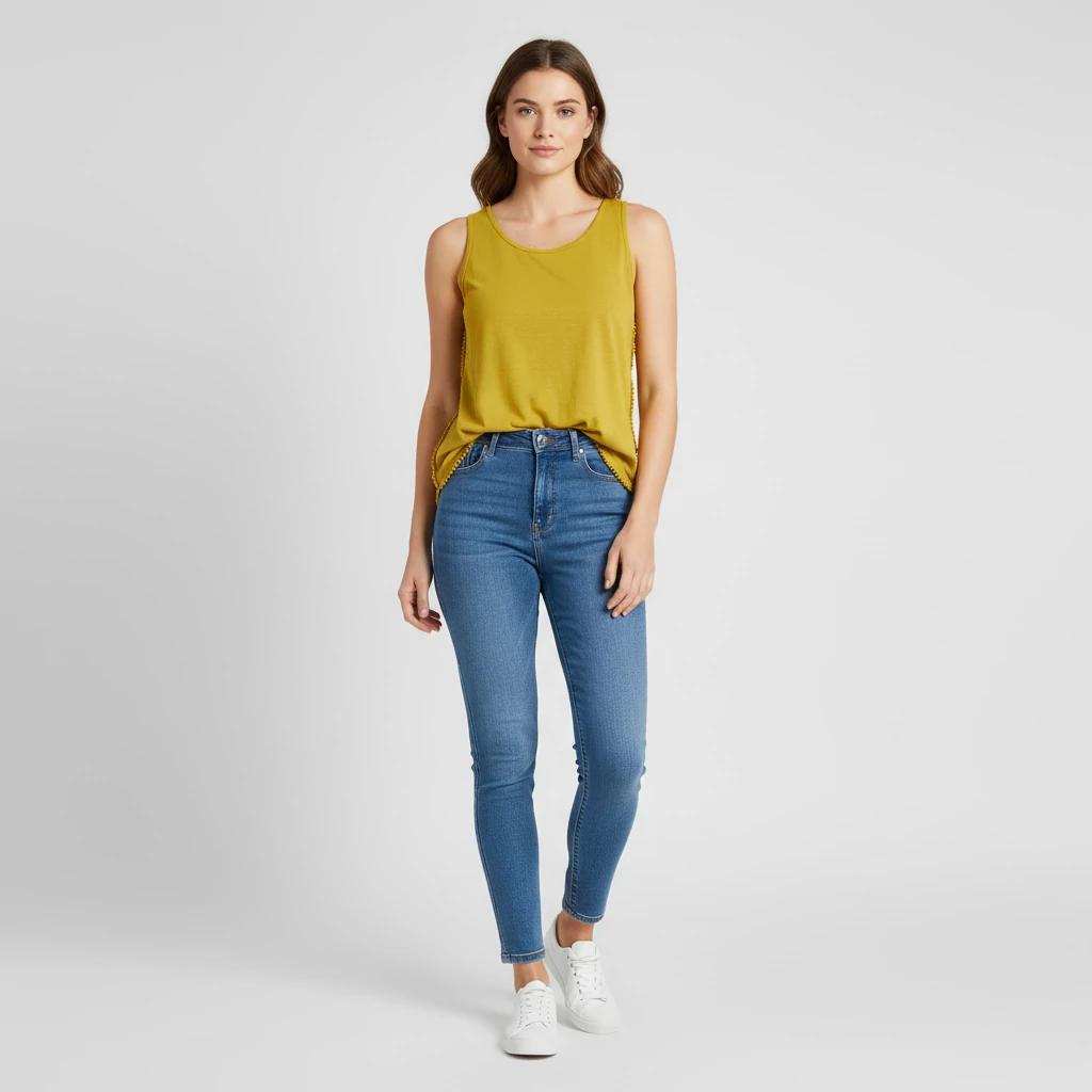 Spagettipántos, alján aszimmetrikus kialakítású, anyagában mintás női felső