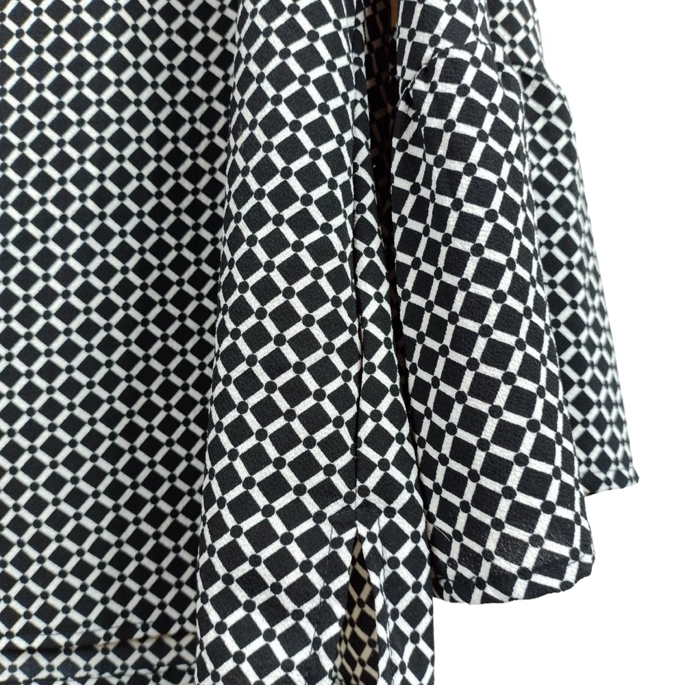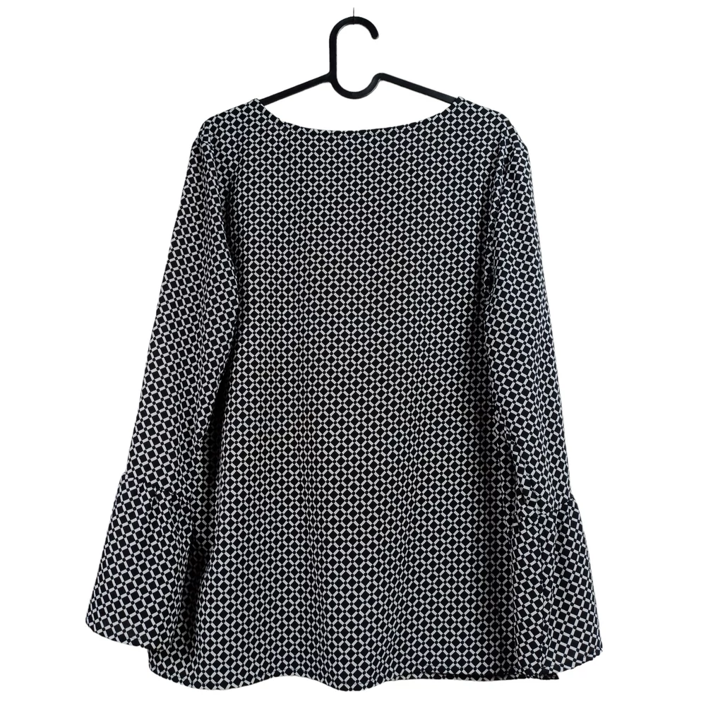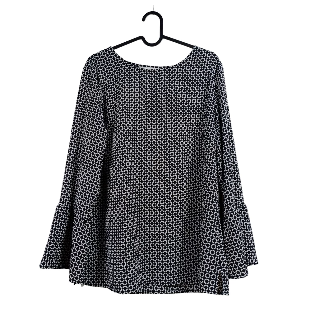 Mellrészén gombos, alján oldalt hosszított, mintás női felső