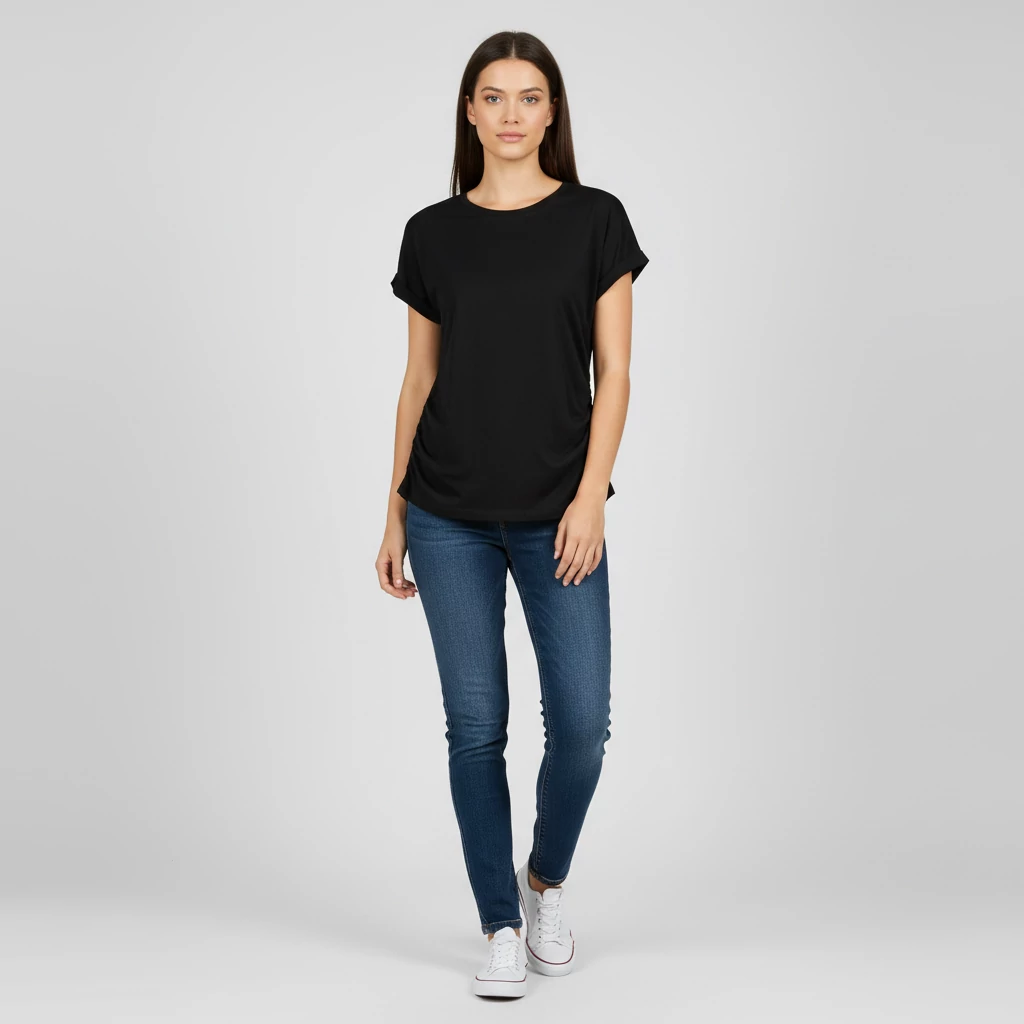 Mellrészén gombos, alján oldalt hosszított, mintás női felső