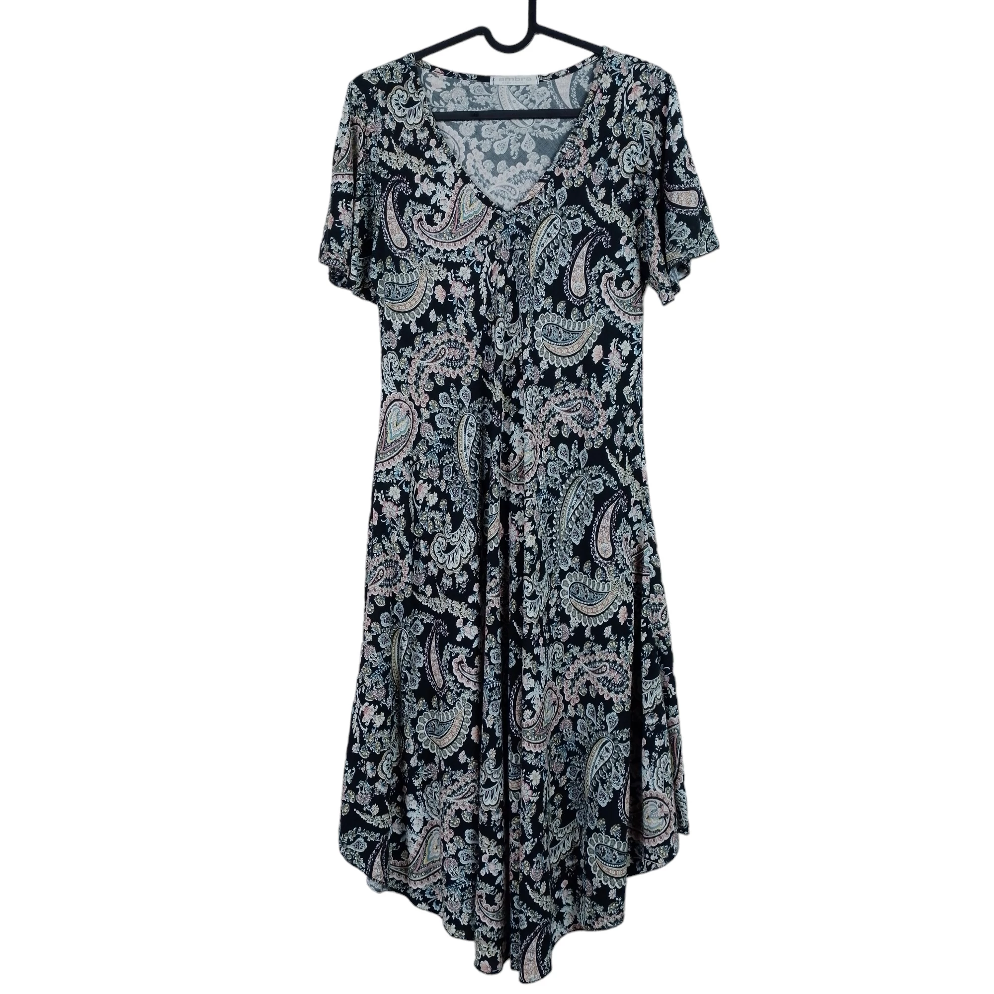 Elején nyitott, mellrészén megkötős, mintás női egész ruha