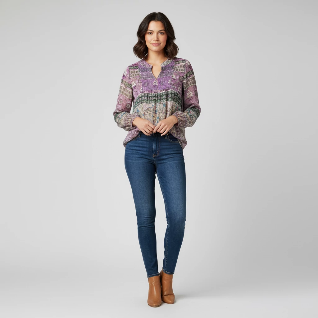 Kámzsanyakú, mintás női felső
